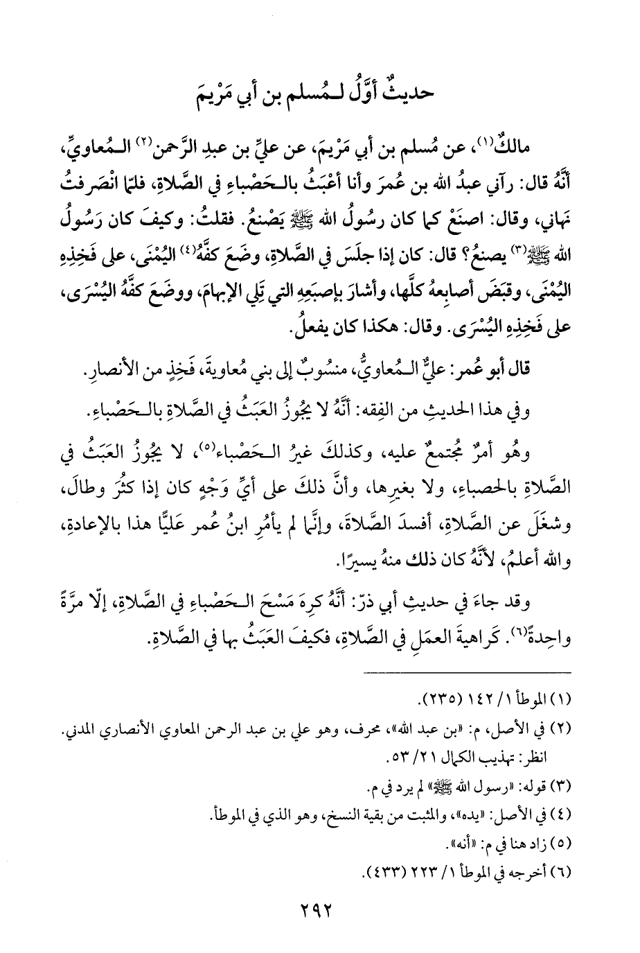 مالكٌ (¬١)، عن مُسلم بن أبي مَرْيمَ، عن عليِّ بن عبدِ الرَّحمن (¬٢) المُعاويِّ، أنَّهُ قال: رآني عبدُ الله بن عُمرَ وأنا أعْبَثُ بالحَصْباءِ في الصَّلاةِ، فلمّا انْصَرفتُ نَهاني، وقال: اصنَعْ كما كان رسُولُ الله - صلى الله عليه وسلم - يَصْنعُ. فقلتُ: وكيفَ كان رَسُولُ الله - صلى الله عليه وسلم - (¬٣) يصنعُ؟ قال: كان إذا جلَسَ في الصَّلاةِ، وضَعَ كفَّهُ (¬٤) اليُمْنَى، على فَخِذِهِ اليُمْنَى، وقبَضَ أصابِعهُ كلَّها، وأشارَ بإصبَعِهِ التي تَلي الإبهامَ، ووضَعَ كفَّهُ اليُسْرَى، على فَخِذِهِ اليُسْرَى. وقال: هكذا كان يفعلُ.