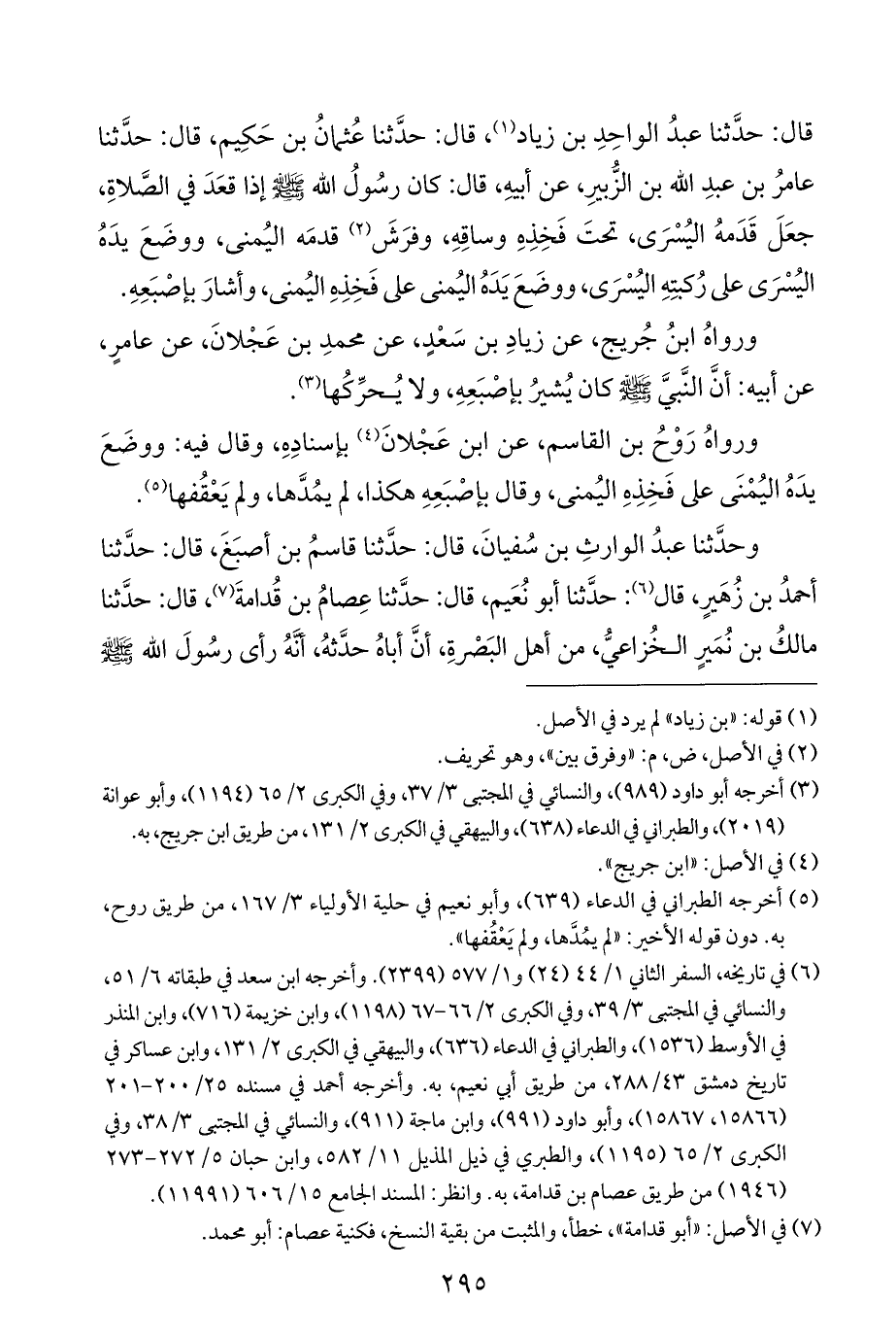 قال: حدَّثنا عبدُ الواحِدِ بن زياد (¬١)، قال: حدَّثنا عُثمانُ بن حَكِيم، قال: حدَّثنا عامرُ بن عبدِ الله بن الزُّبيرِ، عن أبيهِ، قال: كان رسُولُ الله - صلى الله عليه وسلم - إذا قعَدَ في الصَّلاةِ، جعَلَ قَدَمهُ اليُسْرَى، تحتَ فَخِذِهِ وساقِهِ، وفرَشَ (¬٢) قدمَه اليُمنى، ووضَعَ يدَهُ اليُسْرَى على رُكبتِهِ اليُسْرَى، ووضَعَ يَدَهُ اليُمنى على فَخِذِهِ اليُمنى، وأشارَ بإصْبَعِهِ.