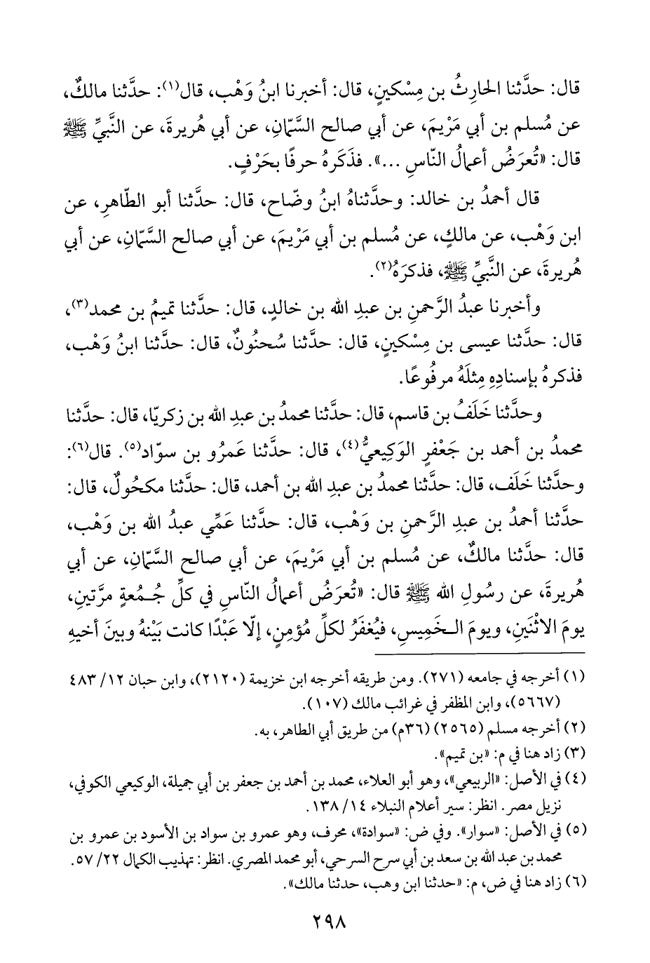وحدَّثنا خَلَفُ بن قاسم، قال: حدَّثنا محمدُ بن عبدِ الله بن زكريّا، قال: حدَّثنا محمدُ بن أحمد بن جَعْفرٍ الوَكِيعيُّ (¬٤)، قال: حدَّثنا عَمرُو بن سوّاد (¬٥). قال (¬٦): وحدَّثنا خَلَف، قال: حدَّثنا محمدُ بن عبدِ الله بن أحمد، قال: حدَّثنا مكحُولٌ، قال: حدَّثنا أحمدُ بن عبدِ الرَّحمنِ بن وَهْب، قال: حدَّثنا عَمِّي عبدُ الله بن وَهْب، قال: حدَّثنا مالكٌ، عن مُسلم بن أبي مَرْيمَ، عن أبي صالح السَّمّانِ، عن أبي هُريرةَ، عن رسُولِ الله - صلى الله عليه وسلم - قال: "تُعرَضُ أعمالُ النّاسِ في كلِّ جُمُعةٍ مرَّتينِ، يومَ الاثْنَينِ، ويومَ الخَمِيسِ، فيُغفَرُ لكلِّ مُؤمِنٍ، إلّا عَبْدًا كانت بَيْنهُ وبينَ أخيهِ