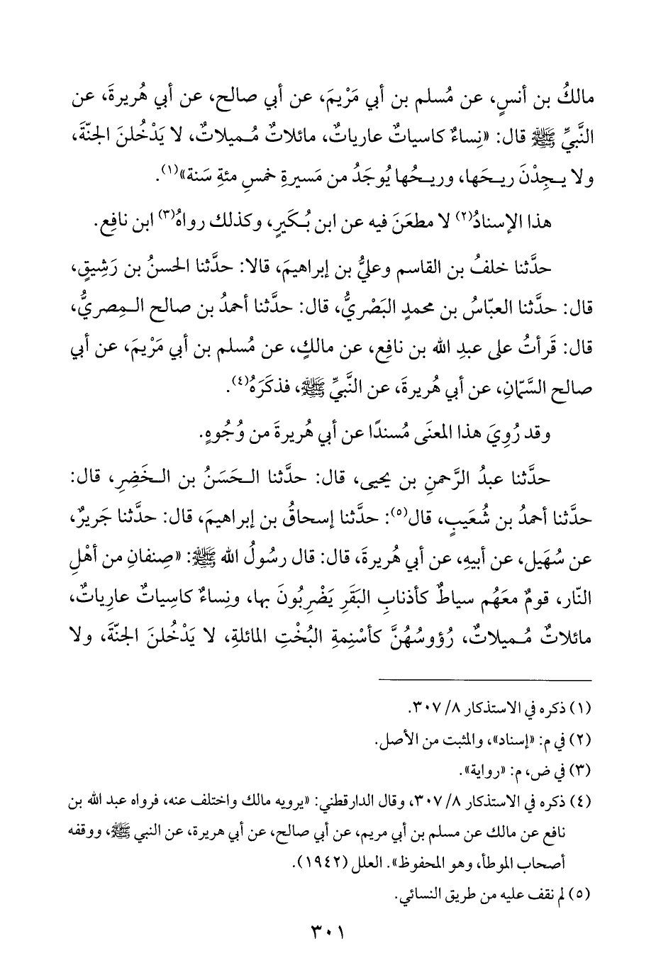 مالكُ بن أنسٍ، عن مُسلم بن أبي مَرْيمَ، عن أبي صالح، عن أبي هُريرةَ، عن النَّبيِّ - صلى الله عليه وسلم - قال: "نِساءٌ كاسياتٌ عارياتٌ، مائلاتٌ مُميلاتٌ، لا يَدْخُلنَ الجنّةَ، ولا يجِدْنَ ريحَها، وريحُها يُوجَدُ من مَسيرةِ خمسِ مئةِ سَنة" (¬١).