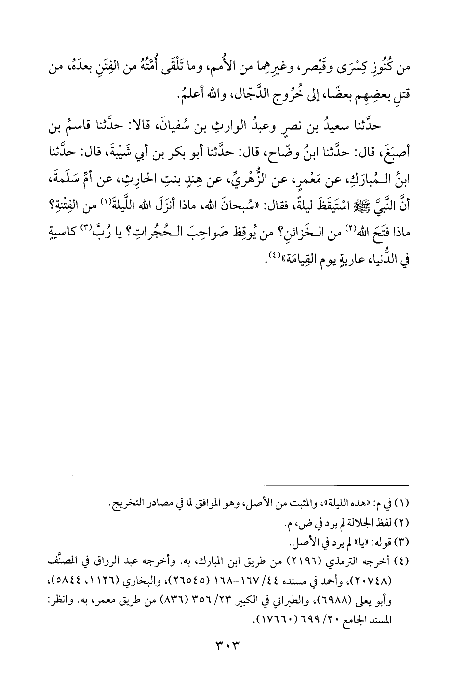 حدَّثنا سعيدُ بن نصرٍ وعبدُ الوارثِ بن سُفيانَ، قالا: حدَّثنا قاسمُ بن أصبَغَ، قال: حدَّثنا ابنُ وضّاح، قال: حدَّثنا أبو بكر بن أبي شَيْبةَ، قال: حدَّثنا ابنُ المُبارَكِ، عن مَعْمرٍ، عن الزُّهْريِّ، عن هِندٍ بنتِ الحارِثِ، عن أمِّ سَلَمةَ، أنَّ النَّبيَّ - صلى الله عليه وسلم - اسْتَيقَظَ ليلةً، فقال: "سُبحانَ الله، ماذا أنزَلَ الله اللَّيلةَ (¬١) من الفِتْنةِ؟ ماذا فتَحَ الله (¬٢) من الخَزائنِ؟ من يُوقِظ صواحِبَ الحُجُراتِ؟ يا رُبَّ (¬٣) كاسيةٍ في الدُّنيا، عاريةٍ يوم القِيامَة" (¬٤).