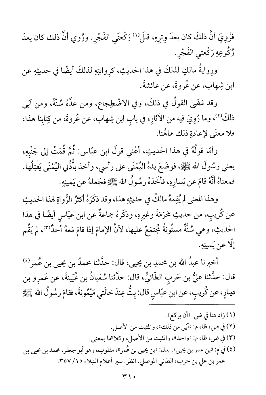 وهذا المعنى لم يُقِمهُ مالكٌ في حديثهِ هذا، وقد ذكَرَهُ أكثرُ الرُّواةِ لهذا الحديثِ عن كُريبٍ، من حديثِ مخرَمَةَ وغيرِهِ، وذكَرهُ جماعةٌ عن ابن عبّاسٍ أيضًا في هذا الحديثِ، وهي سُنَّةٌ مسنُونةٌ مُجتمَعٌ عليها، لأنَّ الإمامَ إذا قامَ مَعهُ أحدٌ (¬٣)، لم يَقُم إلّا عن يَمينِهِ.
