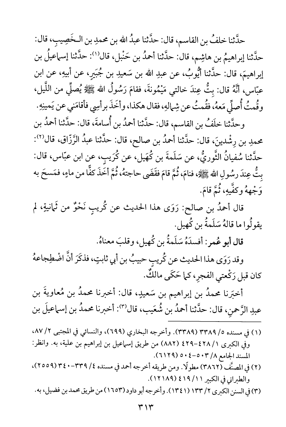 حَدَّثَنَا خلفُ بن القاسم، قال: حَدَّثَنَا عبدُ الله بن محمدِ بن الخَصِيبِ، قال: حَدَّثَنَا إبراهيمُ بن هاشِم، قال: حَدَّثَنَا أحمدُ بن حَنْبل، قال (¬١): حَدَّثَنَا إسماعيلُ بن إبراهيمَ، قال: حَدَّثَنَا أيُّوبُ، عن عبدِ الله بن سَعيدِ بن جُبَيرٍ، عن أبيهِ، عن ابن عبّاس، أنَّهُ قال: بِتُّ عِندَ خالتي مَيْمُونةَ، فقامَ رَسُولُ الله - صَلَّى اللهُ عَلَيْهِ وَسَلَّمَ - يُصلِّي من اللَّيل، وقُمتُ أُصلِّي مَعهُ، فقُمتُ عن شِمالهِ، فقال هكذا، وأخَذَ برأسِي فأقامَني عن يَمينِهِ.