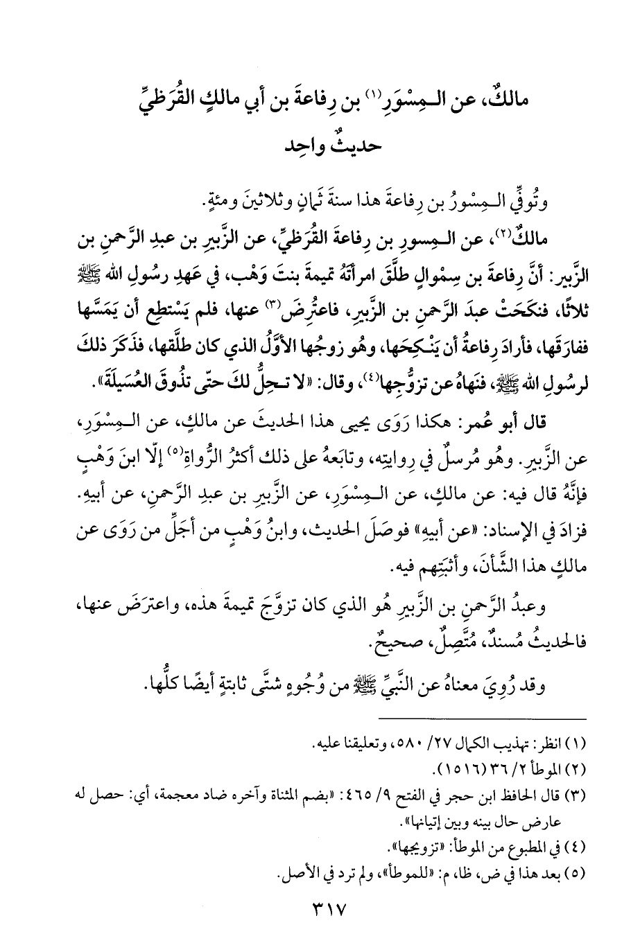 قال أبو عُمر: هكذا رَوَى يحيى هذا الحديثَ عن مالكٍ، عن المِسْوَرِ، عن الزَّبيرِ. وهُو مُرسلٌ في رِوايتِه، وتابَعهُ على ذلك أكثرُ الرُّواةِ (¬٥) إلّا ابنَ وَهْبٍ فإنَّهُ قال فيه: عن مالكٍ، عن المِسْوَرِ، عن الزَّبيرِ بن عبدِ الرَّحمنِ، عن أبيهِ. فزادَ في الإسناد: "عن أبيهِ" فوصَلَ الحديث، وابنُ وَهْبٍ من أجَلِّ من رَوَى عن مالكٍ هذا الشَّأنَ، وأثبَتِهم فيه.