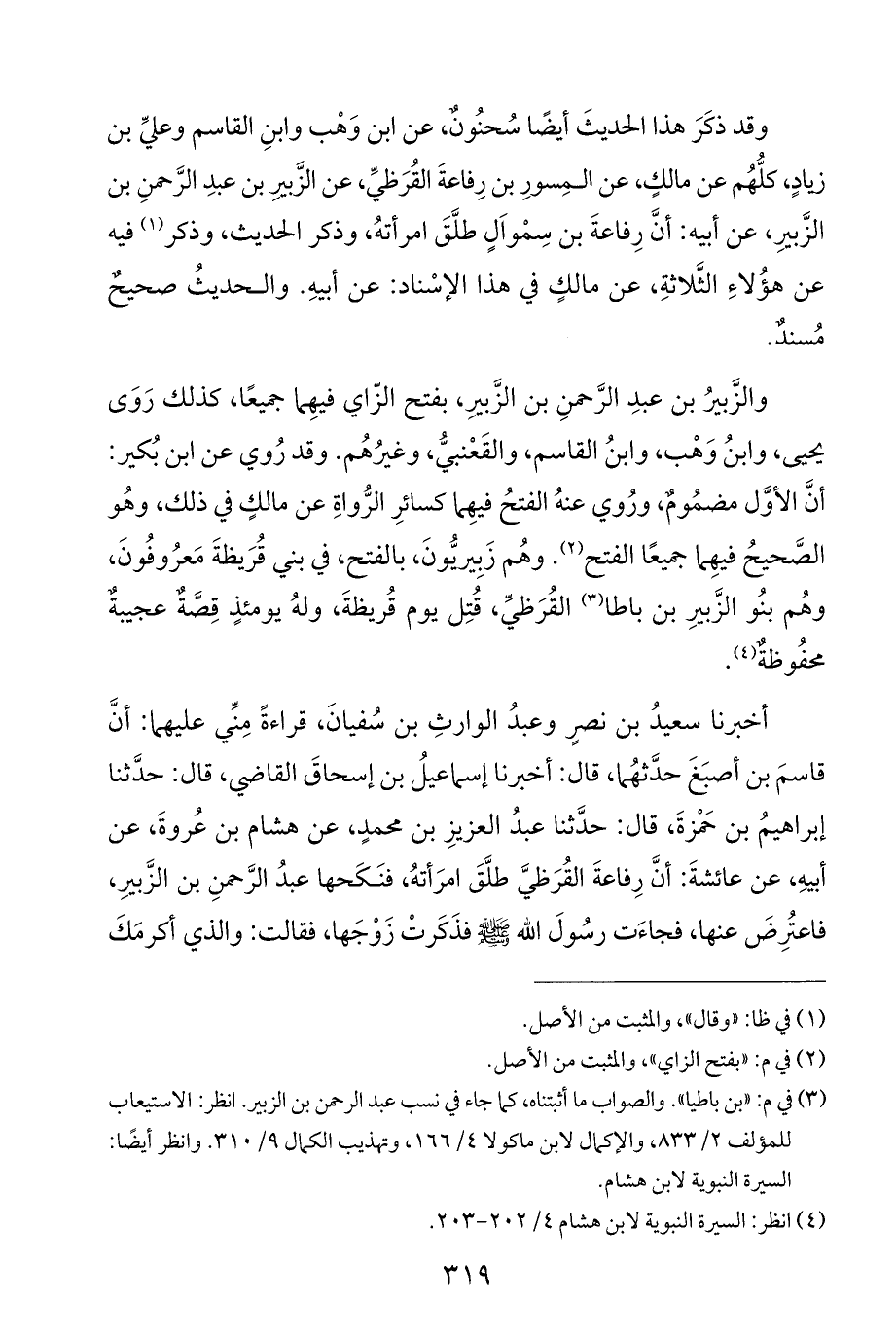 والزَّبيرُ بن عبدِ الرَّحمنِ بن الزَّبيرِ، بفتح الزّاي فيهِما جميعًا، كذلك رَوَى يحيى، وابنُ وَهْب، وابنُ القاسم، والقَعْنبيُّ، وغيرُهُم. وقد رُوي عن ابن بُكير: أنَّ الأوَّل مضمُومٌ، ورُوي عنهُ الفتحُ فيهِما كسائرِ الرُّواةِ عن مالكٍ في ذلك، وهُو الصَّحيحُ فيهِما جميعًا الفتح (¬٢). وهُم زَبِيريُّونَ، بالفتح، في بني قُرَيظةَ مَعرُوفُونَ، وهُم بنُو الزَّبيرِ بن باطا (¬٣) القُرَظيِّ، قُتِل يوم قُريظةَ، ولهُ يومئذٍ قِصَّةٌ عجيبةٌ محفُوظةٌ (¬٤).