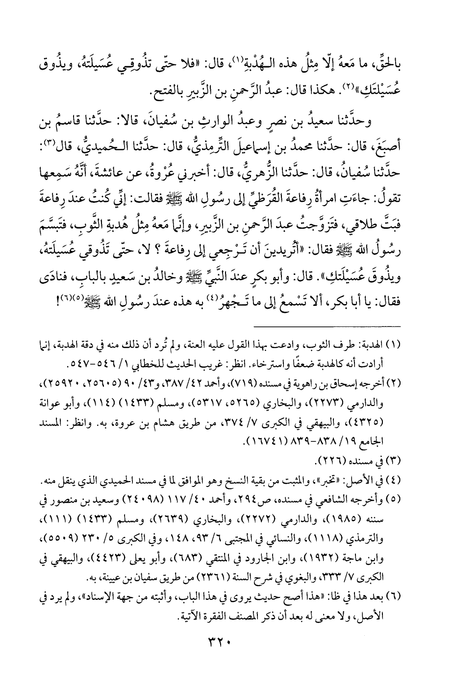 وحَدَّثَنَا سعيدُ بن نصرٍ وعبدُ الوارثِ بن سُفيانَ، قالا: حَدَّثَنَا قاسمُ بن أصبَغَ، قال: حَدَّثَنَا محمدُ بن إسماعيلَ التِّرمذيُّ، قال: حَدَّثَنَا الحُميديُّ، قال (¬٣): حَدَّثَنَا سُفيانُ، قال: حَدَّثَنَا الزُّهريُّ، قال: أخبر في عُرْوةُ، عن عائشةَ، أنَّهُ سمِعها تقولُ: جاءَتِ امرأةُ رِفاعةَ القُرَظيِّ إلى رسُولِ الله - صَلَّى اللهُ عَلَيْهِ وَسَلَّمَ - فقالت: إنِّي كُنتُ عندَ رِفاعةَ فبَتَّ طلاقي، فتَزوَّجتُ عبدَ الرَّحمنِ بن الزَّبيرِ، وإنَّما مَعهُ مِثلُ هُدبةِ الثَّوبِ، فتَبَسَّمَ رسُولُ الله - صَلَّى اللهُ عَلَيْهِ وَسَلَّمَ - فقال: "أَتُريدينَ أن تَرْجِعي إلى رِفاعةَ؟ لا، حتَّى تَذُوقي عُسَيلَتهُ، ويذُوقَ عُسَيْلَتكِ". قال: وأبو بكرٍ عندَ النَّبيِّ - صَلَّى اللهُ عَلَيْهِ وَسَلَّمَ - وخالدُ بن سَعيدٍ بالبابِ، فنادَى فقال: يا أبا بكر، ألا تَسْمعُ إلى ما تَجْهرُ (¬٤) به هذه عندَ رسُولِ الله - صَلَّى اللهُ عَلَيْهِ وَسَلَّمَ - (¬٥) (¬٦)!
