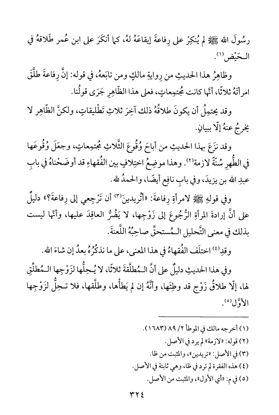 وظاهِرُ هذا الحديثِ من رِوايةِ مالكٍ ومن تابَعهُ، في قوله: إنَّ رِفاعةَ طلَّقَ امرأتَهُ ثلاثًا، أنَّها كانت مُجتمِعاتٍ، فعلى هذا الظّاهِرِ جَرَى قولُنا.