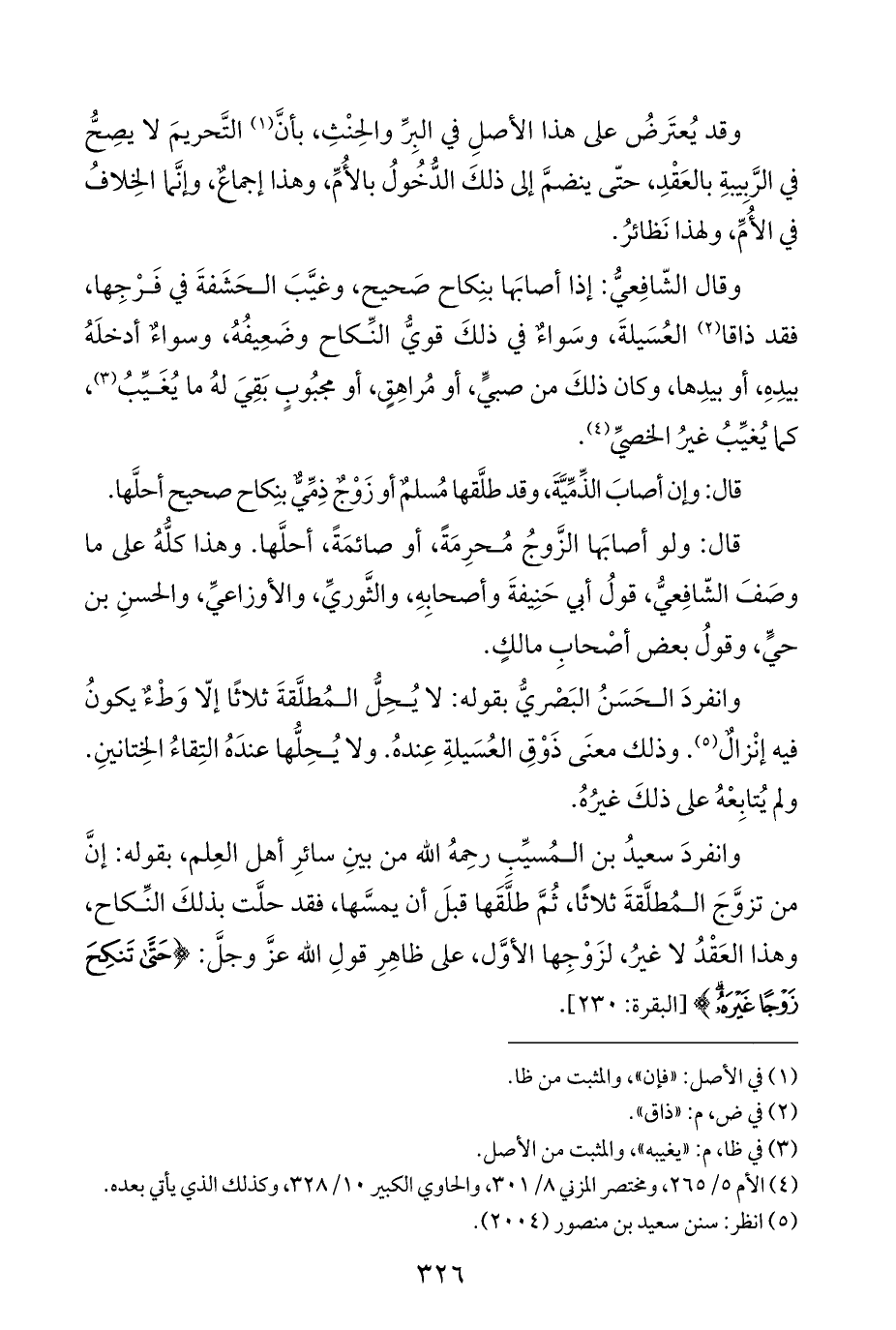 وانفردَ سعيدُ بن المُسيِّب رحِمهُ الله من بينِ سائرِ أهل العِلم، بقوله: إنَّ من تزوَّجَ المُطلَّقةَ ثلاثًا، ثُمَّ طلَّقَها قبلَ أن يمسَّها، فقد حلَّت بذلكَ النِّكاح، وهذا العَقْدُ لا غيرُ، لزَوْجِها الأوَّل، على ظاهِرِ قولِ الله عزَّ وجلَّ: {حَتَّى تَنْكِحَ زَوْجًا غَيْرَهُ} [البقرة: ٢٣٠].
