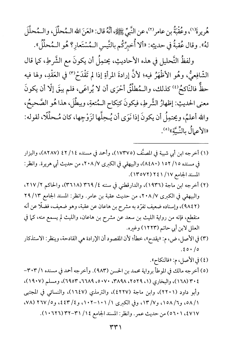 ولفظُ التَّحليل في هذه الأحاديثِ، يحتمِلُ أن يكونَ مع الشَّرطِ، كما قال الشّافِعيُّ، وهُو الأظْهَرُ فيه، لأنَّ إرادةَ المرأةِ إذا لم تَقْدَح" (¬٣) في العَقْدِ، ولها فيه حظٌّ فالنّاكحُ (¬٤) كذلك، والمُطلِّقُ أحْرَى أن لا يُراعَي، فلم يبقَ إلّا أن يكونَ معنى الحديثِ: إظهارُ الشَّرطِ، فيكونَ كنِكاح المُتعةِ، ويبطُلَ، هذا هُو الصحيحُ، واللّه أعلمُ، ويحتمِلُ أن يكونَ إذا نَوَى أن يُحِلَّها لزَوْجِها، كان مُحلِّلًا، لقوله: "الأعمالُ بالنِّيَّةِ" (¬٥).