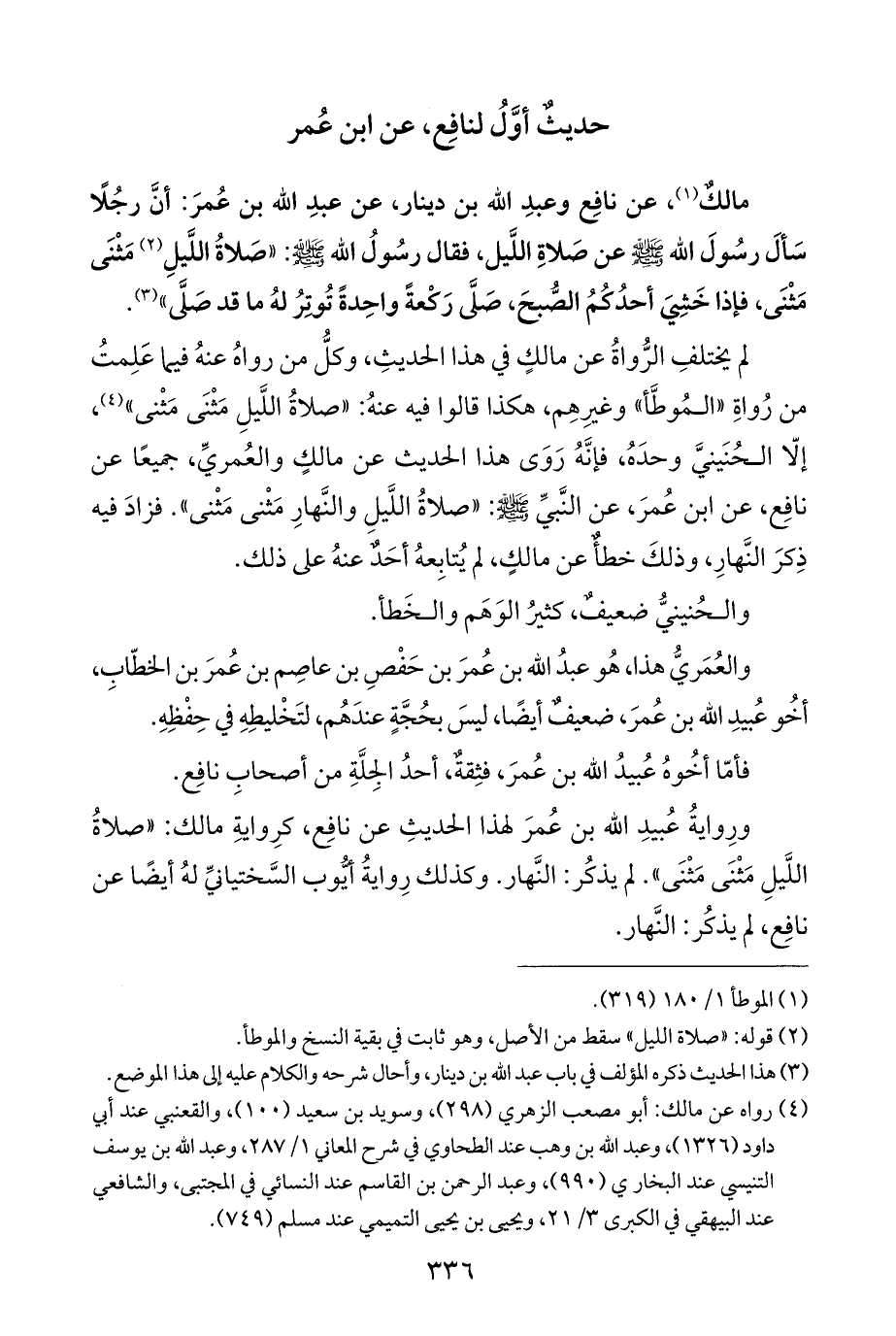 من رُواةِ "المُوطَّأ" وغيرِهِم، هكذا قالوا فيه عنهُ: "صلاةُ اللَّيلِ مَثْنَى مَثْنى" (¬٤)، إلّا الحُنَينيَّ وحدَهُ، فإنَّهُ رَوَى هذا الحديث عن مالكٍ والعُمريِّ، جميعًا عن نافِع، عن ابن عُمرَ، عن النَّبيِّ - صَلَّى اللهُ عَلَيْهِ وَسَلَّمَ -: "صلاةُ اللَّيلِ والنَّهارِ مَثْنى مَثْنى". فزادَ فيه ذِكرَ النَّهارِ، وذلكَ خطأٌ عن مالكٍ، لم يُتابِعهُ أحَدٌ عنهُ على ذلك.