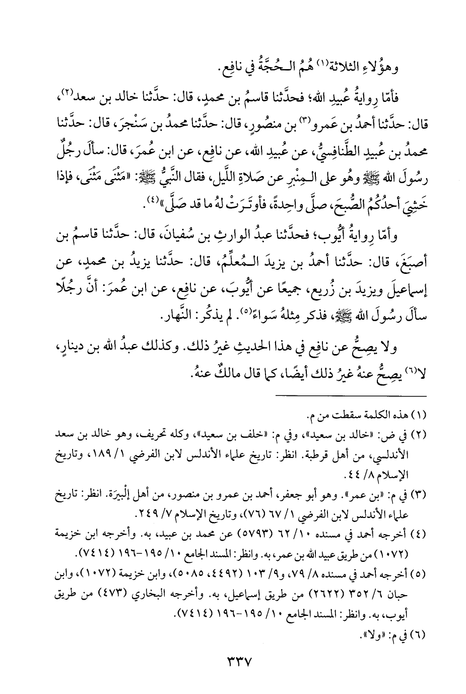 فأمّا رِوايةُ عُبيدِ الله؛ فحَدَّثَنَا قاسمُ بن محمدٍ، قال: حَدَّثَنَا خالد بن سعد (¬٢)، قال: حَدَّثَنَا أحمدُ بن عَمرو (¬٣) بن منصُورٍ، قال: حَدَّثَنَا محمدُ بن سَنْجرَ، قال: حَدَّثَنَا محمدُ بن عُبيدٍ الطَّنافِسيُّ، عن عُبيدِ الله، عن نافِع، عن ابن عُمرَ، قال: سألَ رجُلٌ رسُولَ الله - صَلَّى اللهُ عَلَيْهِ وَسَلَّمَ - وهُو على المِنْبرِ عن صَلاةِ اللَّيل، فقال النَّبيُّ - صَلَّى اللهُ عَلَيْهِ وَسَلَّمَ -: "مَثْنَى مَثْنَى، فإذا خَشِيَ أحدُكُمُ الصبحَ، صلَّى واحِدةً، فأوتَرَتْ لهُ ما قد صَلَّى" (¬٤).