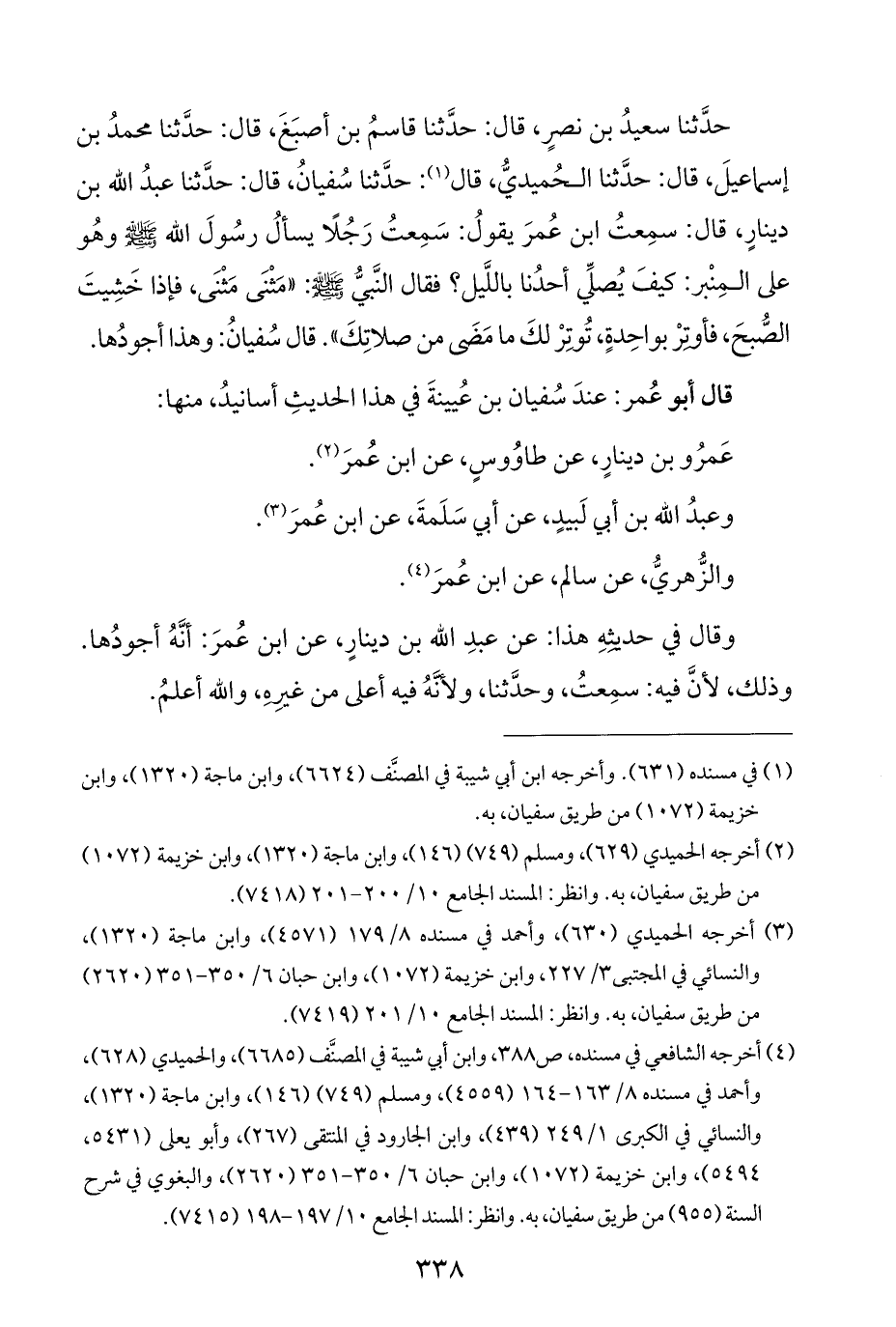 حَدَّثَنَا سعيدُ بن نصرٍ، قال: حَدَّثَنَا قاسمُ بن أصبَغَ، قال: حَدَّثَنَا محمدُ بن إسماعيلَ، قال: حَدَّثَنَا الحُميديُّ، قال (¬١): حَدَّثَنَا سُفيانُ، قال: حَدَّثَنَا عبدُ الله بن دينارٍ، قال: سمِعتُ ابن عُمرَ يقولُ: سَمِعتُ رَجُلًا يسألُ رسُولَ الله - صَلَّى اللهُ عَلَيْهِ وَسَلَّمَ - وهُو على المِنْبر: كيفَ يُصلِّي أحدُنا باللَّيل؟ فقال النَّبيُّ - صَلَّى اللهُ عَلَيْهِ وَسَلَّمَ -: "مَثْنَى مَثْنَى، فإذا خَشِيتَ الصُّبحَ، فأوْتِرْ بواحِدةٍ، تُوتِرْ لكَ ما مَضَى من صلاتِكَ". قال سُفيانُ: وهذا أجودُها.