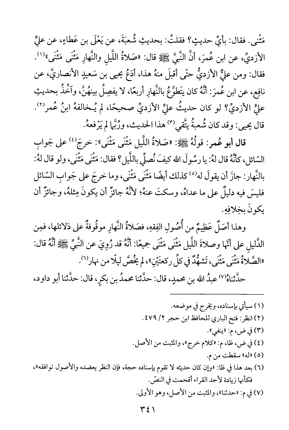 وهذا أصَلٌ عَظِيم من أُصُولِ الفِقهِ، فصَلاةُ النَّهارِ موقُوفة على دَلائلها، فمِن الدَّليلِ على أنَّها وصلاةَ اللَّيل مَثْنَى مَثْنَى جميعًا: أَنَّهُ قد رُوِيَ عن النَّبيِّ - صَلَّى اللهُ عَلَيْهِ وَسَلَّمَ - أَنَّهُ قال: "الصلاةُ مَثْنَى مَثْنَى، تَشهُّدٌ في كلِّ ركعتَيْنِ"، لم يخُصَّ ليلًا من نهار (¬٦).