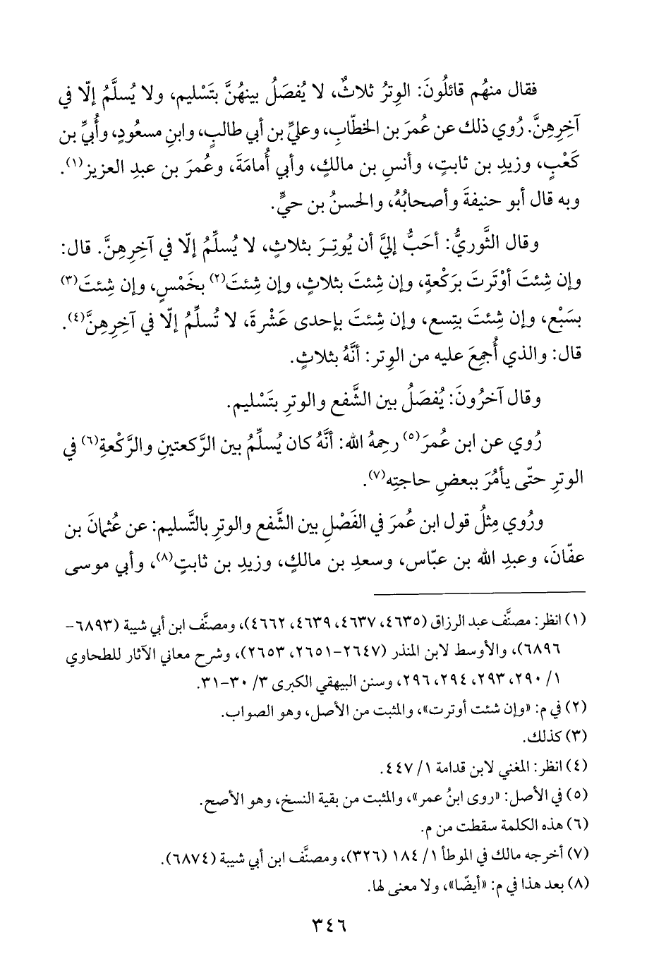 ورُوي مِثلُ قول ابن عُمرَ في الفَصْلِ بين الشَّفع والوترِ بالتَّسليم: عن عُثمانَ بن عفّانَ، وعبدِ الله بن عبّاس، وسعدِ بن مالكٍ، وزيدِ بن ثابتٍ (¬٨)، وأبي موسى