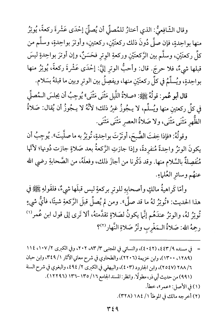 قال أبو عُمر: قولُهُ - صَلَّى اللهُ عَلَيْهِ وَسَلَّمَ -: "صلاةُ اللَّيل مَثْنَى مَثْنَى" يُوجِبُ أن يجلسَ المُصلِّي في كلِّ ركعتينِ منها ويُسلِّم، لا يجُوزُ غيرُ ذلك، لأنَّهُ لا يجُوزُ أن يُقال: صَلاةُ الظُّهرِ مَثْنَى مَثْنَى، ولا صَلاةُ العصرِ مَثْنَى مَثْنَى.