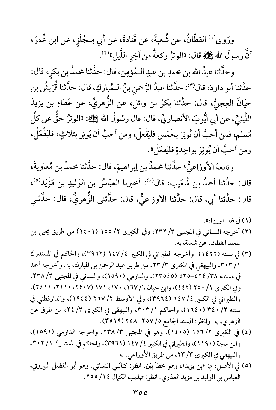 وحَدَّثَنَا عبدُ الله بن محمدِ بن عبدِ المُؤمِن، قال: حَدَّثَنَا محمدُ بن بكير، قال: حَدَّثَنَا أبو داودَ، قال (¬٣): حَدَّثَنَا عبدُ الرَّحمنِ بنُ المُباركِ، قال: حَدَّثَنَا قُرَيشُ بن حيّانَ العِجليُّ، قال: حَدَّثَنَا بكرُ بن وائل، عن الزُّهريِّ، عن عَطاءِ بن يزيدَ اللَّيثيِّ، عن أبي أيُّوبَ الأنصاريِّ، قال: قال رسُولُ الله - صَلَّى اللهُ عَلَيْهِ وَسَلَّمَ -: "الوترُ حقٌّ على كلِّ مُسلم، فمن أحبَّ أن يُوتِرَ بخَمْس فليَفْعلْ، ومن أحبَّ أن يُوتِر بثلاثٍ، فليَفْعَلْ، ومن أحبَّ أن يُوتِرَ بواحِدةٍ فليَفْعَلْ".