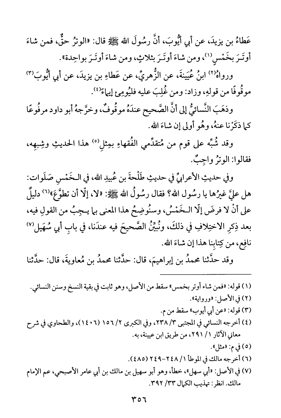 عَطاءُ بن يزيدَ، عن أبي أيُّوبَ، أنَّ رسُولَ الله - صَلَّى اللهُ عَلَيْهِ وَسَلَّمَ - قال: "الوترُ حقٌّ، فمن شاءَ أوتَرَ بخَمْسٍ (¬١)، ومن شاءَ أوتَرَ بثلاثٍ، ومن شاءَ أوتَرَ بواحِدة".