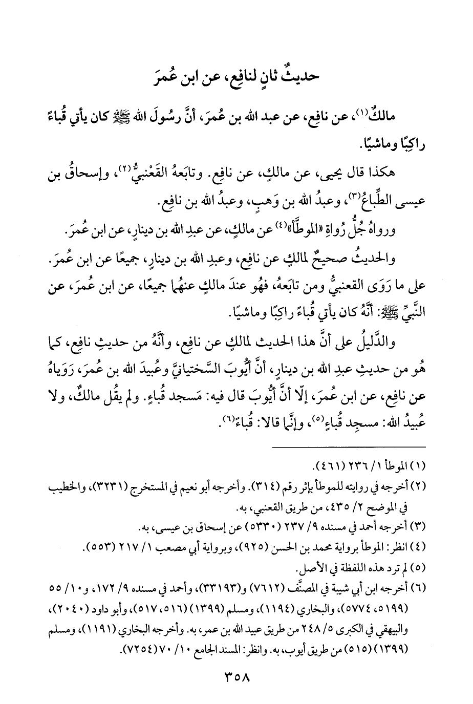 والحديثُ صحيحٌ لمالكٍ عن نافِع، وعبدِ الله بن دينارٍ، جميعًا عن ابن عُمرَ. على ما رَوَى القعنبيُّ ومن تابَعهُ، فهُو عندَ مالكٍ عنهُما جميعًا، عن ابن عُمرَ، عن النَّبيِّ - صَلَّى اللهُ عَلَيْهِ وَسَلَّمَ -: أنَّهُ كان يأتي قُباءً راكِبًا وماشيًا.