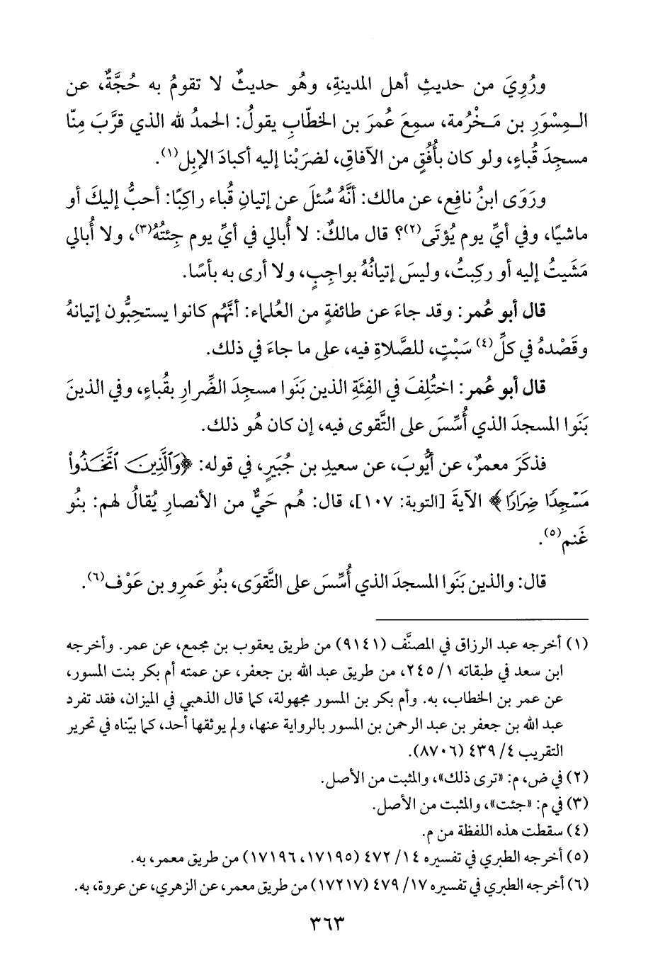 ورُوِيَ من حديثِ أهل المدينةِ، وهُو حديثٌ لا تقومُ به حُجَّةٌ، عن المِسْوَرِ بن مَخْرُمة، سمِعَ عُمرَ بن الخطّابِ يقولُ: الحمدُ لله الذي قرَّبَ مِنّا مسجِدَ قُباءٍ، ولو كان بأُفُقٍ من الآفاقِ، لضرَبْنا إليه أكبادَ الإبِل (¬١).