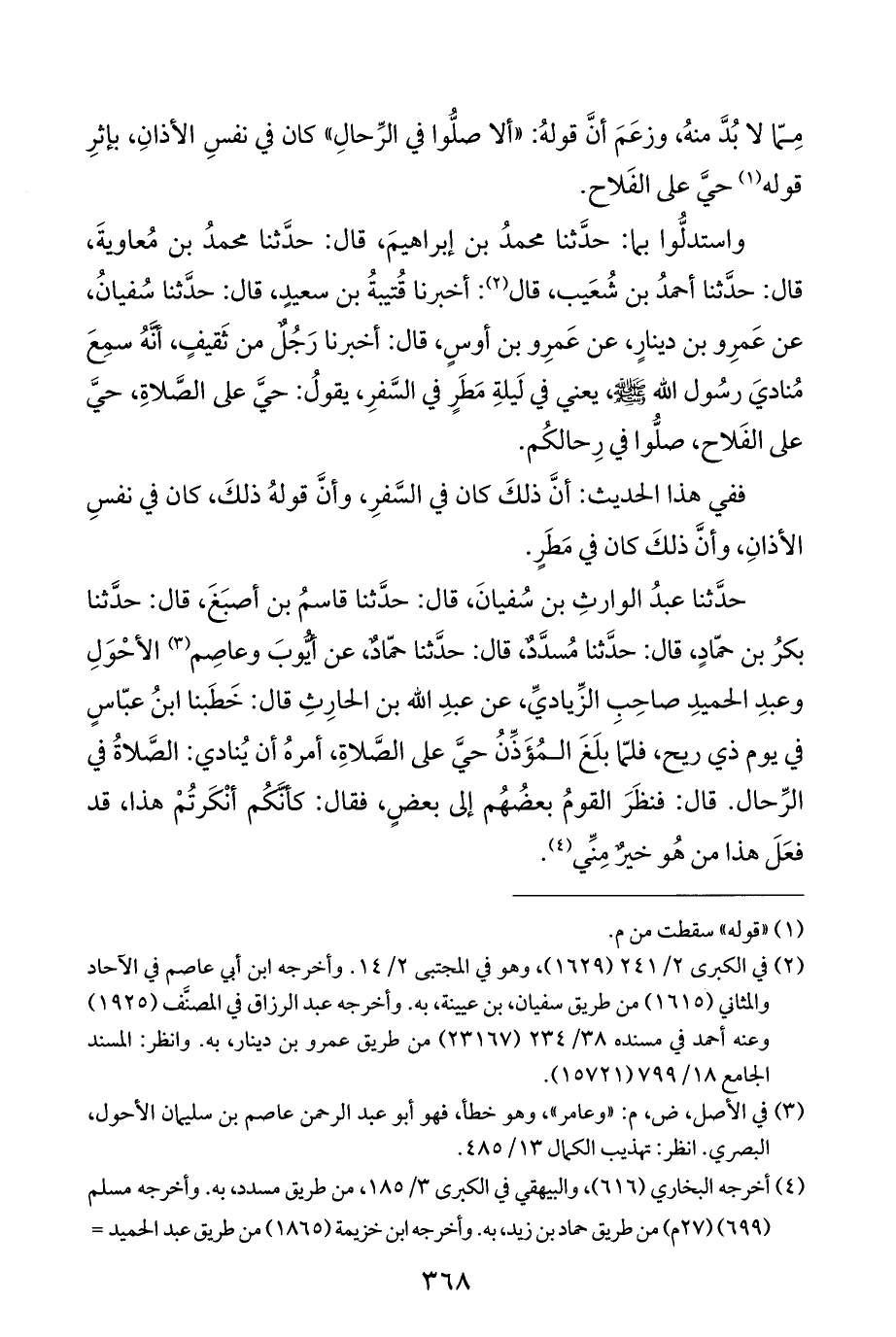 حدَّثنا عبدُ الوارثِ بن سُفيانَ، قال: حدَّثنا قاسمُ بن أصبَغَ، قال: حدَّثنا بكرُ بن حمّادٍ، قال: حدَّثنا مُسدَّدٌ، قال: حدَّثنا حمّادٌ، عن أيُّوبَ وعاصِم (¬٣) الأحْوَلِ وعبدِ الحميدِ صاحِبِ الزِّياديِّ، عن عبدِ الله بن الحارِثِ قال: خَطَبنا ابنُ عبّاسٍ في يوم ذي ريح، فلمّا بلَغَ المُؤَذِّنُ حيَّ على الصَّلاةِ، أمرهُ أن يُنادي: الصَّلاةُ في الرِّحال. قال: فنظَرَ القومُ بعضُهُم إلى بعضٍ، فقال: كأنَّكُم أنْكَرتُمْ هذا، قد فعَلَ هذا من هُو خيرٌ مِنِّي (¬٤).