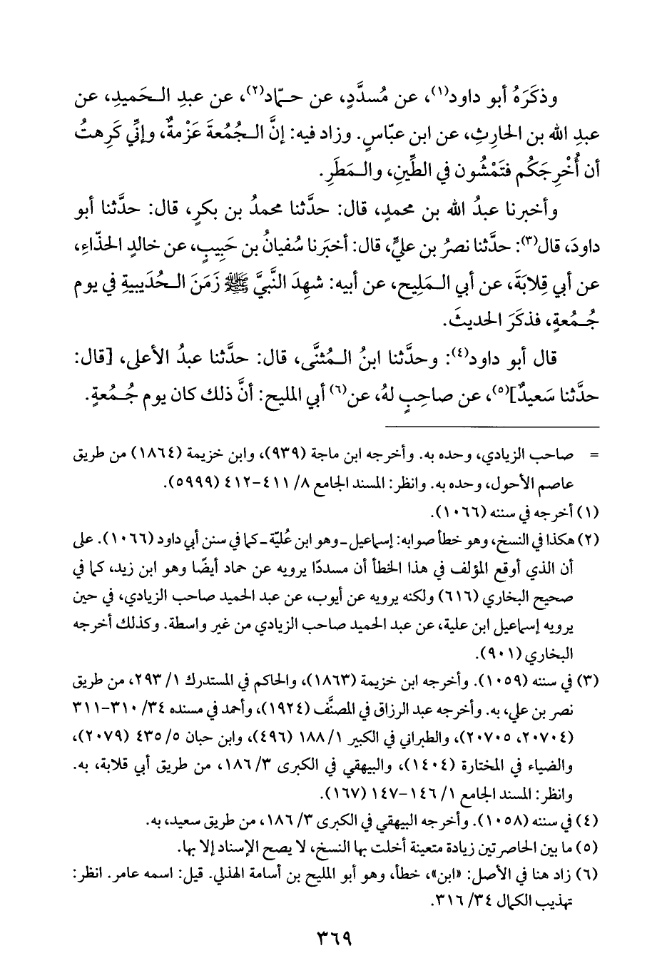(¬٢) هكذا في النسخ، وهو خطأ صوابه: إسماعيل - وهو ابن عُليّة - كما في سنن أبي داود (١٠٦٦). على أن الذي أوقع المؤلف في هذا الخطأ أن مسددًا يرويه عن حماد أيضًا وهو ابن زيد، كما في صحيح البخاري (٦١٦) ولكنه يرويه عن أيوب، عن عبد الحميد صاحب الزيادي، في حين يرويه إسماعيل ابن علية، عن عبد الحميد صاحب الزيادي من غير واسطة. وكذلك أخرجه البخاري (٩٠١).