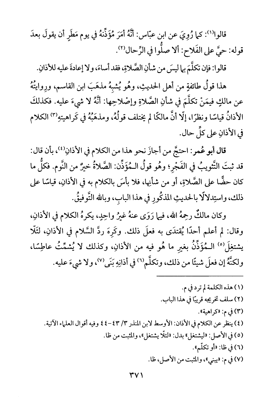 هذا قولُ طائفةٍ من أهل الحديثِ، وهُو يُشبِهُ مذهَبَ ابن القاسم، ورِوايتُهُ عن مالكٍ فيمَنْ تكلَّمَ في شأنِ الصَّلاةِ وإصْلاحِها: أنَّهُ لا شيءَ عليه. فكذلكَ الأذانُ قياسًا ونظرًا، إلّا أنَّ مالكًا لم يختلف قولُهُ، ومذهَبُهُ في كَراهيتهِ (¬٣) الكلام في الأذانِ على كلِّ حال.