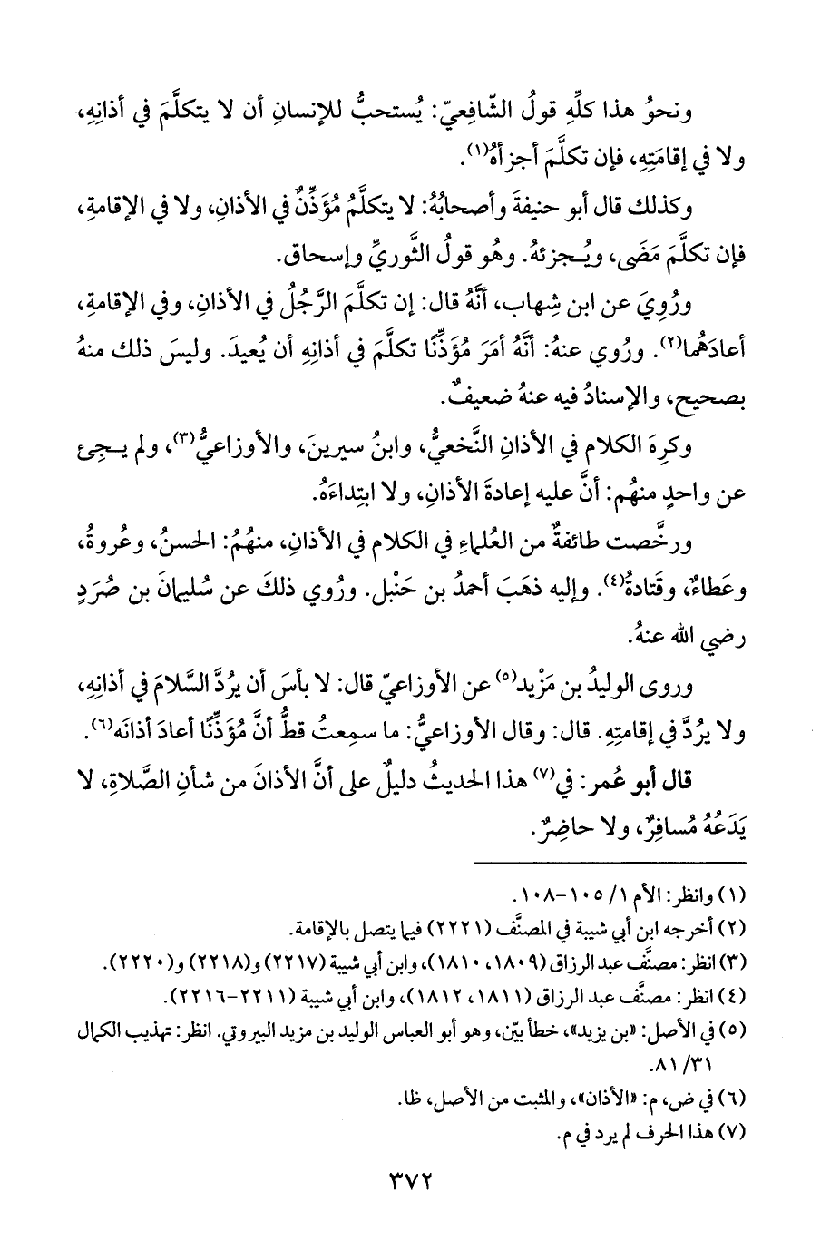 ونحوُ هذا كلِّهِ قولُ الشّافِعيّ: يُستحبُّ للإنسانِ أن لا يتكلَّمَ في أذانِهِ، ولا في إقامَتِهِ، فإن تكلَّمَ أجزأهُ (¬١).
