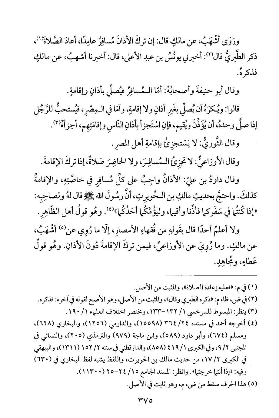 ورَوَى أشْهَبُ، عن مالكٍ قال: إن تركَ الأذانَ مُسافِرٌ عامِدًا، أعادَ الصَّلاةَ (¬١)، ذكر الطَّبريُّ قال (¬٢): أخبرني يونُسُ بن عبدِ الأعلى، قال: أخبرنا أشهبُ، عن مالكٍ فذكرهُ.