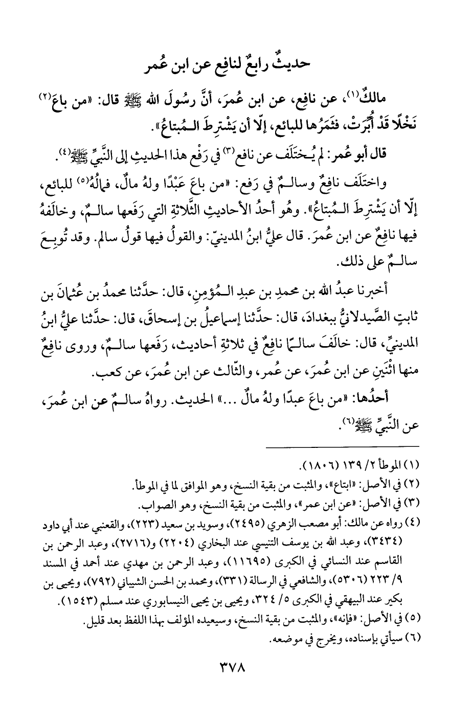 أحدُها: "من باعَ عبدًا ولهُ مالٌ ... " الحديث. رواهُ سالمٌ عن ابن عُمرَ، عن النَّبيِّ - صلى الله عليه وسلم - (¬٦).