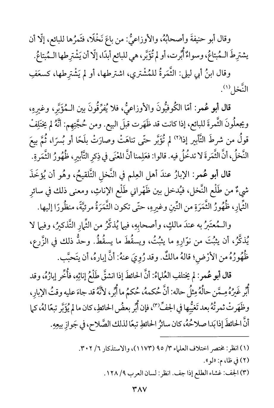 قال أبو عُمر: أمّا الكُوفيُّونَ والأوزاعيُّ، فلا يُفرِّقُونَ بين المُؤَبَّرِ، وغيرِهِ، ويجعلُونَ الثَّمرةَ للبائع، إذا كانت قد ظَهَرت قبلَ البيع. ومن حُجَّتِهِم: أنَّهُ لم يختَلِفْ قولُ من شرطَ التَّأبير إذا (¬٢) لم تُؤَبَّر حتَّى تناهَتْ وصارَتْ بلَحًا أو بُسرًا، ثُمَّ بيعَ النَّخلُ، أنَّ الثَّمَرةَ لا تدخُلُ فيه. قالوا: فعَلِمنا أنَّ المعْنَى في ذِكرِ التَّأبيرِ، ظُهُورُ الثَّمَرةِ.