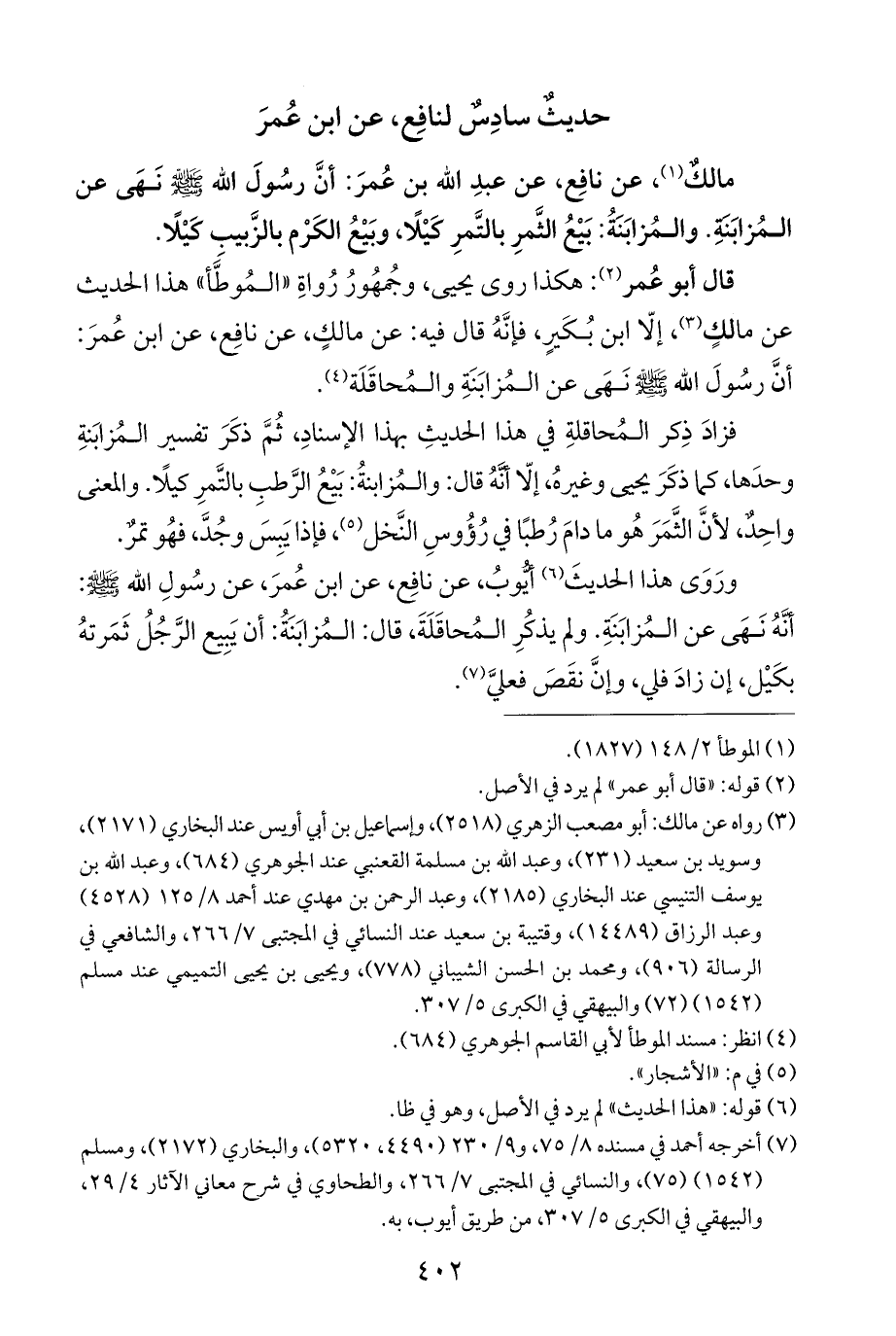 قال أبو عُمر (¬٢): هكذا روى يحيى، وجُمهُورُ رُواةِ "المُوطَّأ" هذا الحديث عن مالكٍ (¬٣)، إلّا ابن بُكَيرٍ، فإنَّهُ قال فيه: عن مالكٍ، عن نافِع، عن ابن عُمرَ: أنَّ رسُولَ الله - صلى الله عليه وسلم - نَهَى عن المُزابَنَةِ والمُحاقَلَة (¬٤).