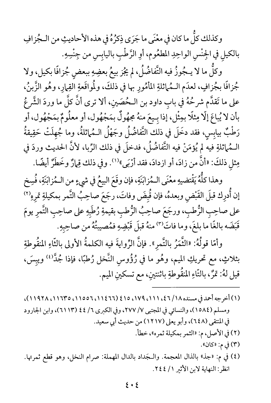 وأمّا قولُهُ: "الثَّمَرُ بالتَّمرِ". فإنَّ الرِّوايةَ فيه الكلمةُ الأولى بالثّاءِ المنقُوطةِ بثلاثٍ، مع تحريكِ الميم، وهُو ما في رُؤُوسِ النَّخل رُطبًا، فإذا جُدَّ (¬٤) ويبِسَ، قيل لهُ: تمرٌ، بالتّاءِ المنقُوطةِ باثنتينِ، مع تسكينِ الميم.