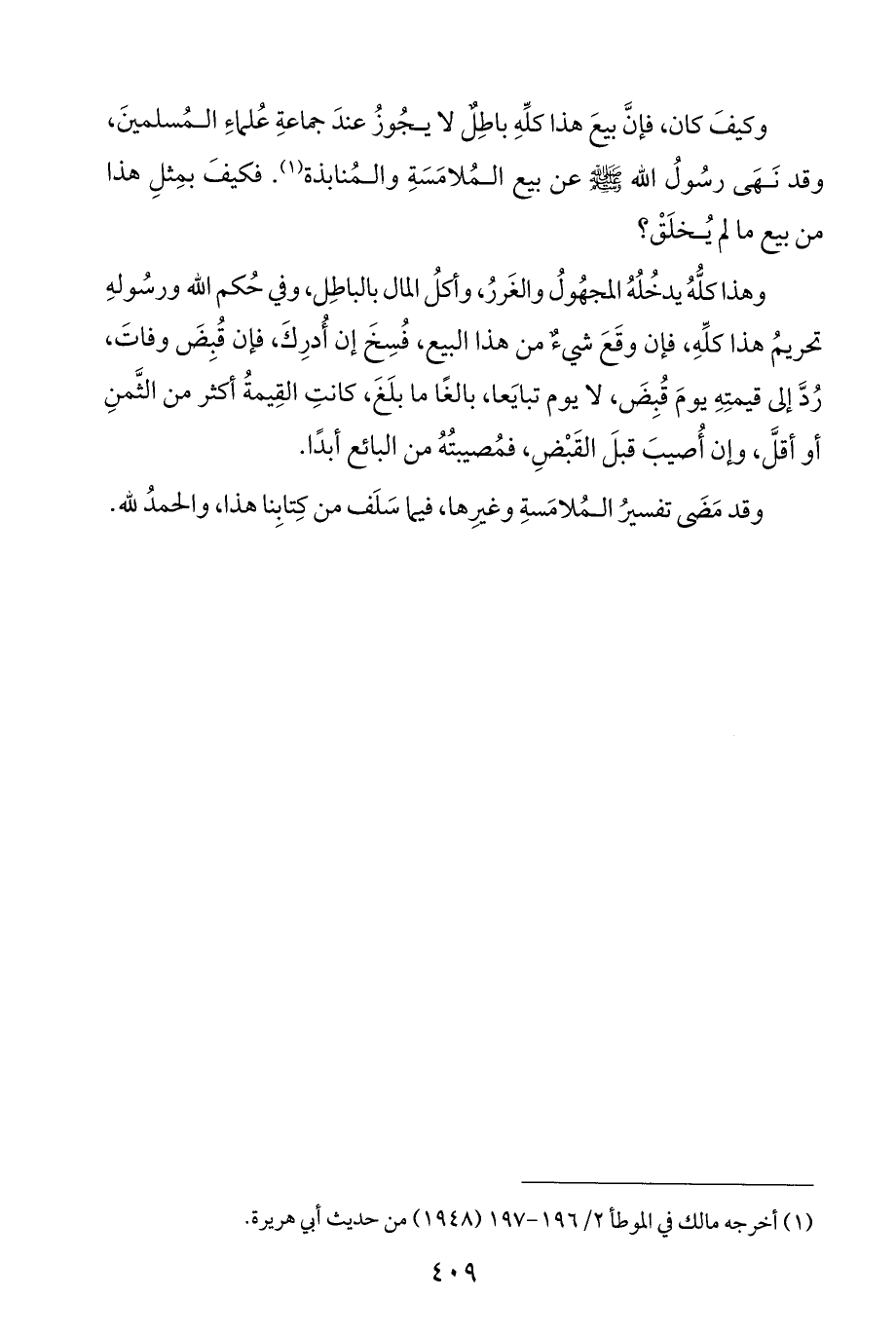 وكيفَ كان، فإنَّ بيعَ هذا كلِّهِ باطِلٌ لا يجُوزُ عندَ جماعةِ عُلماءِ المُسلمينَ، وقد نَهَى رسُولُ الله - صلى الله عليه وسلم - عن بيع المُلامَسَةِ والمُنابذة (¬١). فكيفَ بمِثلِ هذا من بيع ما لم يُخلَقْ؟