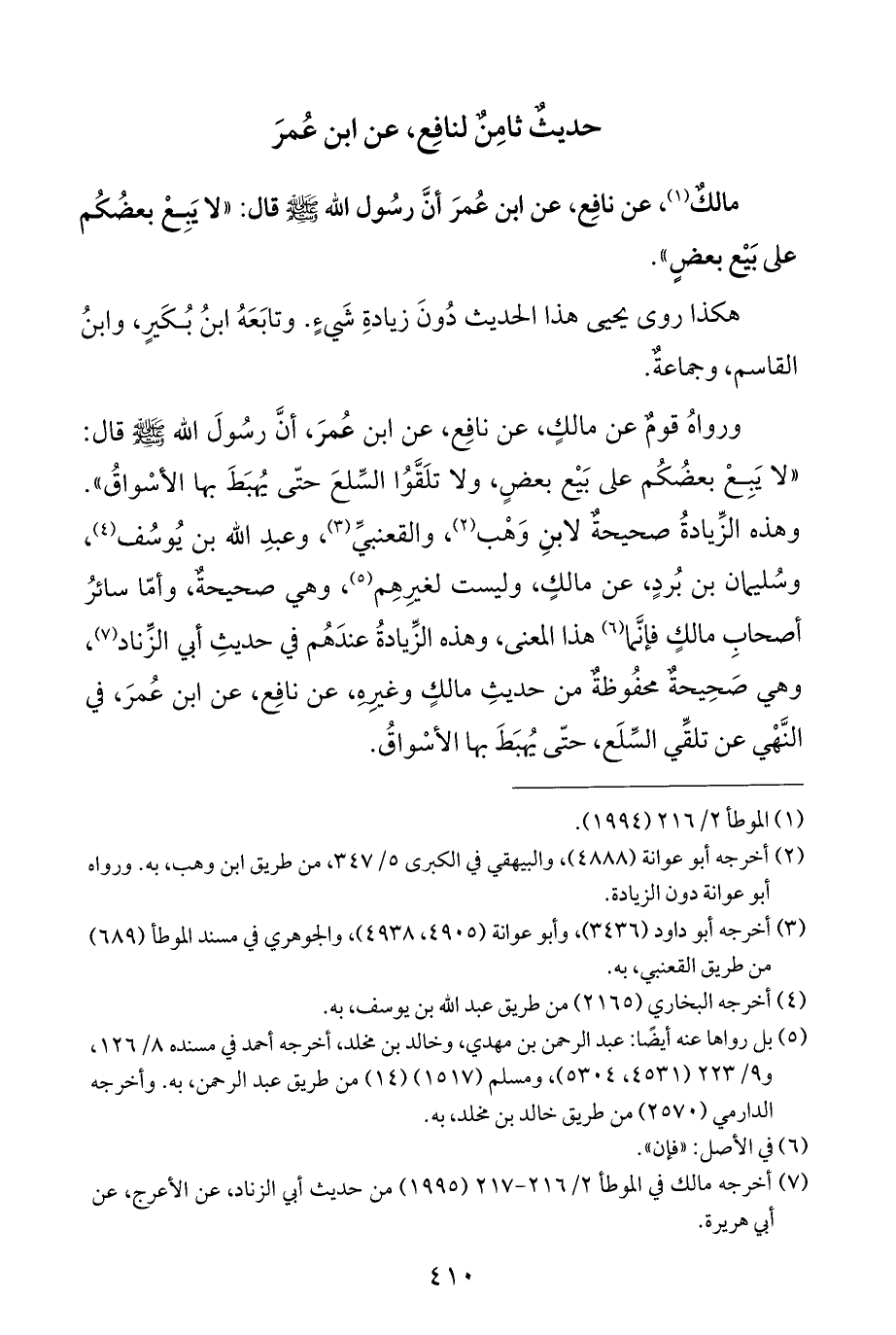 ورواهُ قومٌ عن مالكٍ، عن نافِع، عن ابن عُمرَ، أنَّ رسُولَ الله - صلى الله عليه وسلم - قال: "لا يَبِعْ بعضُكُم على بَيْع بعضٍ، ولا تلَقَّوُا السِّلعَ حتَّى يُهبَطَ بها الأسْواقُ". وهذه الزِّيادةُ صحيحةٌ لابنِ وَهْب (¬٢)، والقعنبيِّ (¬٣)، وعبدِ الله بن يُوسُف (¬٤)، وسُليمان بن بُردٍ، عن مالكٍ، وليست لغيرِهِم (¬٥)، وهي صحيحةٌ، وأمّا سائرُ أصحابِ مالكٍ فإنَّما (¬٦) هذا المعنى، وهذه الزِّيادةُ عندَهُم في حديثِ أبي الزِّناد (¬٧)، وهي صَحِيحةٌ محفُوظةٌ من حديثِ مالكٍ وغيرِهِ، عن نافِع، عن ابن عُمرَ، في النَّهْي عن تلقِّي السِّلَع، حتَّى يُهبَطَ بها الأسْواقُ.