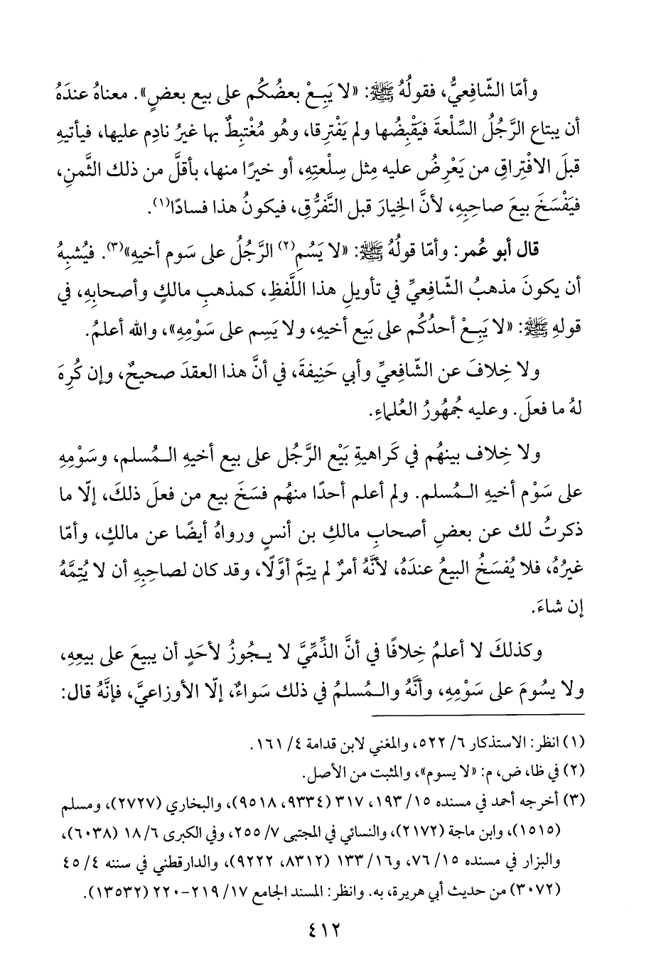 ولا خِلاف بينهم في كراهيةِ بَيْع الرَّجُل على بيع أخيهِ المُسلم، وسَوْمِهِ على سَوْم أخيهِ المُسلم. ولم أعلم أحدًا منهُم فسَخَ بيع من فعلَ ذلكَ، إلّا ما ذكرتُ لك عن بعضِ أصحابِ مالكِ بن أنسٍ ورواهُ أيضًا عن مالكٍ، وأمّا غيرُهُ، فلا يُفسَخُ البيعُ عندَهُ، لأنَّهُ أمرٌ لم يتِمَّ أوَّلًا، وقد كان لصاحِبِهِ أن لا يُتمَّهُ إن شاءَ.