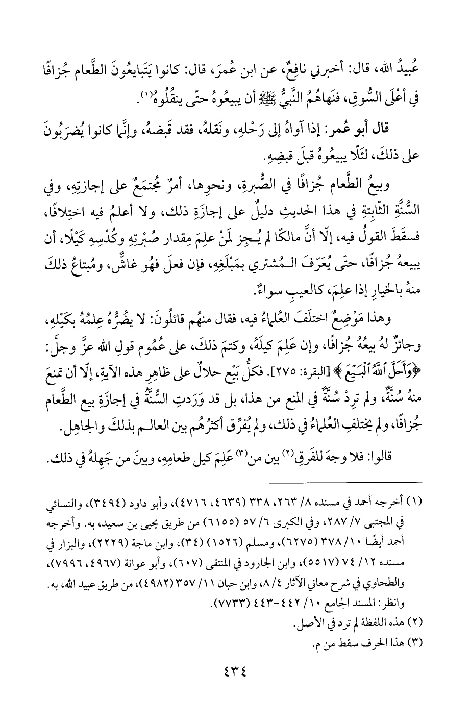 وهذا مَوْضِعٌ اختلَفَ العُلماءُ فيه، فقال منهُم قائلُونَ: لا يضُر عِلمُهُ بكَيْلهِ، وجائز لهُ بيعُهُ جُزافًا، وإن عَلِمَ كيلَهُ، وكتمَ ذلكَ، على عُمُوم قولِ الله عزَّ وجلَّ: {وَأَحَلَّ اللَّهُ الْبَيْعَ} [البقرة: ٢٧٥] فكلُّ بَيْع حلالٌ على ظاهِرِ هذه الآية، إلّا أن تمنعَ منه سُنَّةٌ، ولم ترِدْ سُنَّةٌ في المنع من هذا، بل قد وَرَدتِ السُّنَّةُ في إجازةِ بيع الطَّعام جُزافًا، ولم يختلفِ العُلماءُ في ذلك، ولم يُفرِّق أكثرُهُم بين العالم بذلكَ والجاهِل.