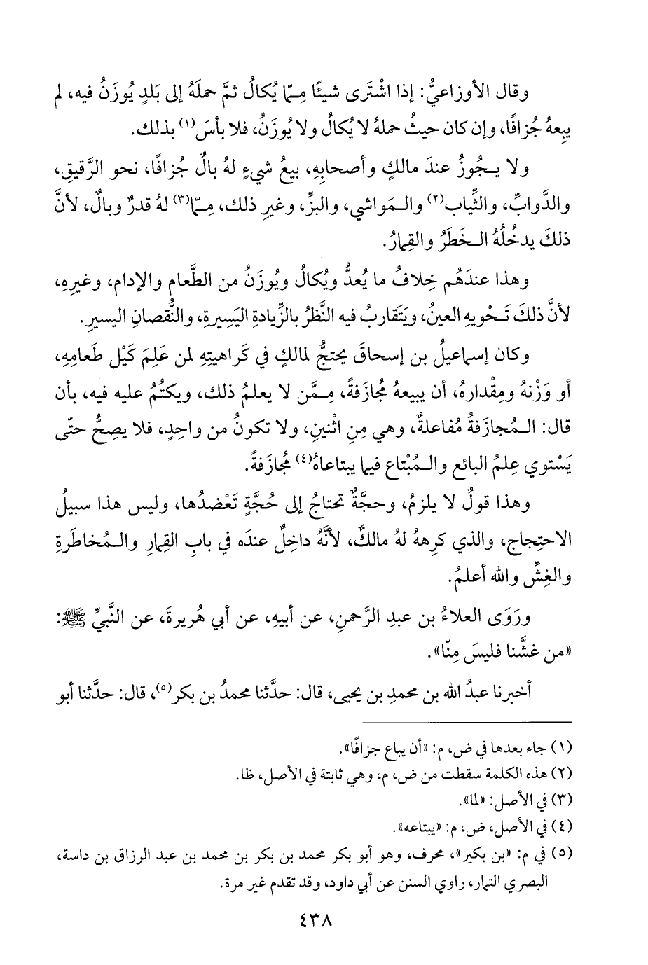 وكان إسماعيلُ بن إسحاقَ يحتجُّ لمالكٍ في كَراهيتِهِ لمن عَلِمَ كَيْل طَعامِهِ، أو وَزْنهُ ومِقْدارهُ، أن يبيعهُ مجُازَفةً، مِمَّن لا يعلمُ ذلك، ويكتُمُ عليه فيه، بأن قال: المُجازَفةُ مُفاعلة، وهي مِنِ اثْنينِ، ولا تكونُ من واحِدٍ، فلا يصِحُّ حتَّى يَسْتوي عِلمُ البائع والمُبْتاع فيما يبتاعاهُ (¬٤) مُجازَفةً.