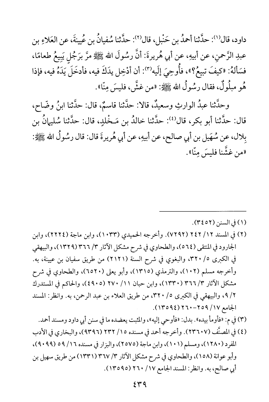 داود، قال (¬١): حدَّثنا أحمدُ بن حَنْبل، قال (¬٢): حدَّثنا سُفيانُ بن عُيينةَ، عن العَلاءِ بن عبدِ الرَّحمنِ، عن أبيهِ، عن أبي هُريرةَ: أنَّ رسُولَ الله - صلى الله عليه وسلم - مرَّ برَجُلٍ يَبِيعُ طعامًا، فسَألهُ: "كيفَ تبيعُ؟ "، فأُوحِيَ إلَيه (¬٣): أن أدْخِل يدَكَ فيه، فأدخَلَ يَدَهُ فيه، فإذا هُو مبلُولٌ، فقال رسُولُ الله - صلى الله عليه وسلم -: "من غشَّ، فليسَ مِنّا".