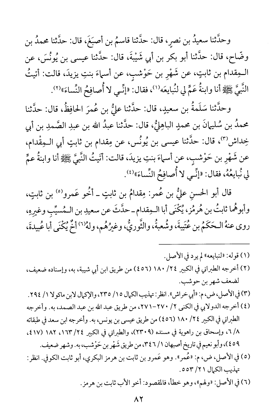 وحدَّثنا سعيدُ بن نصرٍ، قال: حدَّثنا قاسمُ بن أصبَغَ، قال: حدَّثنا محمدُ بن وضّاح، قال: حدَّثنا أبو بكر بن أبي شَيْبةَ، قال: حدَّثنا عيسى بن يُونُسَ، عن المِقدام بن ثابتٍ، عن شَهْرِ بن حَوْشبٍ، عن أسماءَ بنتِ يزيدَ، قالت: أتيتُ النَّبيَّ - صلى الله عليه وسلم - أنا وابنةُ عَمٍّ لي لنُبايعَه (¬١)، فقال: "إنِّي لا أُصافِحُ النِّساءَ" (¬٢).