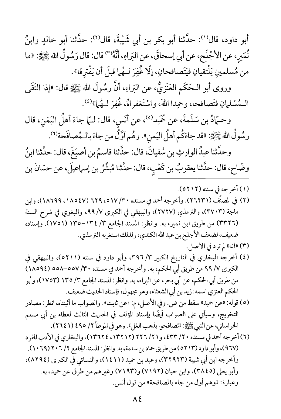 أبو داود، قال (¬١): حدَّثنا أبو بكر بن أبي شَيْبةَ، قال (¬٢): حدَّثنا أبو خالدٍ وابنُ نُمَيرٍ، عن الأجْلَح، عن أبي إسحاقَ، عن البَراءِ، أنَّهُ (¬٣) قال: قال رَسُولُ الله - صلى الله عليه وسلم -: "ما من مُسلمينِ يَلْتقيانِ فيَتَصافحانِ، إلّا غُفِرَ لهُما قبلَ أن يَفْترِقا".