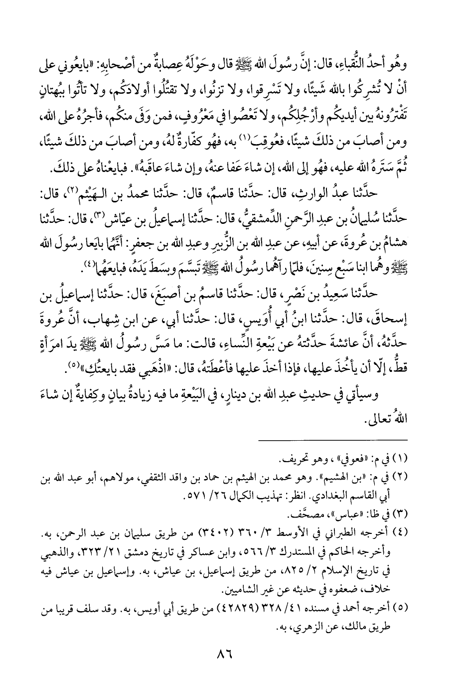 حدَّثنا سَعِيدُ بن نَصْرٍ، قال: حدَّثنا قاسمُ بن أصبَغَ، قال: حدَّثنا إسماعيلُ بن إسحاقَ، قال: حدَّثنا ابنُ أبي أُوَيسٍ، قال: حدَّثنا أبي، عن ابن شِهاب، أنَّ عُروةَ حدَّثهُ، أنَّ عائشةَ حدَّثتهُ عن بَيْعةِ النِّساءِ، قالت: ما مَسَّ رسُولُ الله - صلى الله عليه وسلم - يدَ امرَأةٍ قطُّ، إلّا أن يأخُذَ عليها، فإذا أخذَ عليها فأعْطَتهُ، قال: "اذْهَبي فقد بايعتُكِ" (¬٥).