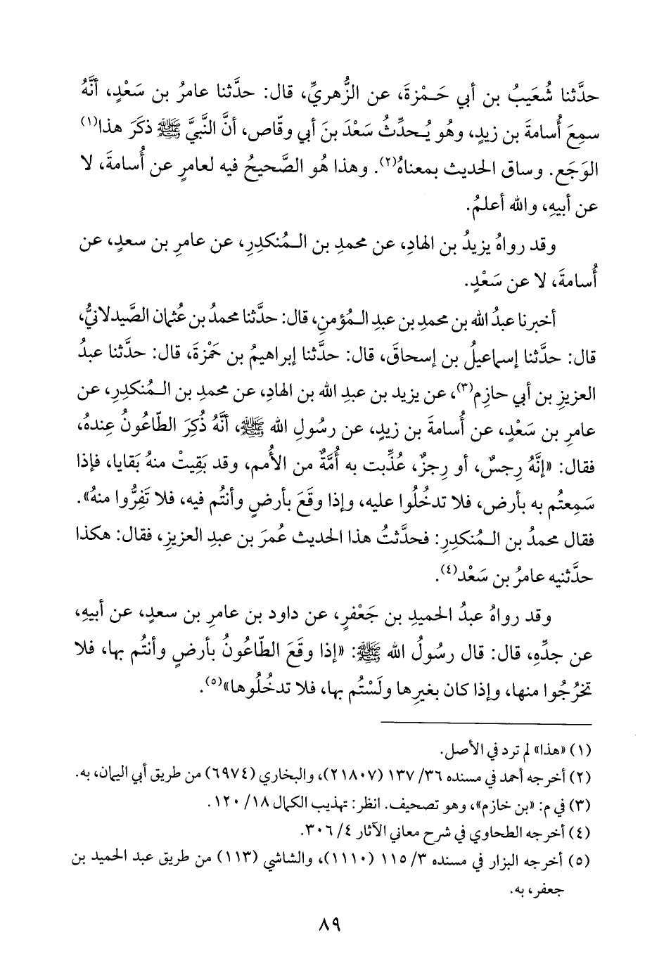 أخبرنا عبدُ الله بن محمدِ بن عبدِ المُؤمنِ، قال: حدَّثنا محمدُ بن عُثمان الصَّيدلانيُّ، قال: حدَّثنا إسماعيلُ بن إسحاقَ، قال: حدَّثنا إبراهيمُ بن حَمْزةَ، قال: حدَّثنا عبدُ العزيزِ بن أبي حازِم (¬٣)، عن يزيد بن عبدِ الله بن الهادِ، عن محمدِ بن المُنكدِرِ، عن عامرِ بن سَعْدٍ، عن أُسامةَ بن زيدٍ، عن رسُولِ الله - صلى الله عليه وسلم -، أنَّهُ ذُكِرَ الطّاعُونُ عِندهُ، فقال: "إنَّهُ رِجسٌ، أو رِجزٌ، عُذِّبت به أُمَّةٌ من الأُمم، وقد بَقِيتْ منهُ بَقايا، فإذا سَمِعتُم به بأرض، فلا تدخُلُوا عليه، وإذا وقَعَ بأرضٍ وأنتُم فيه، فلا تَفِرُّوا منهُ". فقال محمدُ بن المُنكدِرِ: فحدَّثتُ هذا الحديث عُمرَ بن عبدِ العزيزِ، فقال: هكذا حدَّثنيه عامرُ بن سَعْد (¬٤).