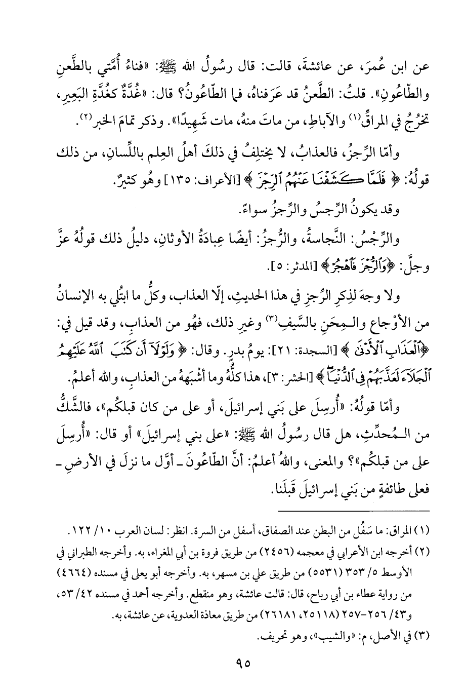 ولا وجهَ لذِكرِ الرِّجزِ في هذا الحديثِ، إلّا العذاب، وكلُّ ما ابتُلي به الإنسانُ من الأوْجاع والمِحَنِ بالسَّيفِ (¬٣) وغيرِ ذلك، فهُو من العذاب، وقد قيل في: {الْعَذَابِ الْأَدْنَى} [السجدة: ٢١]: يومُ بدرٍ. وقال: {وَلَوْلَا أَنْ كَتَبَ اللَّهُ عَلَيْهِمُ الْجَلَاءَ لَعَذَّبَهُمْ فِي الدُّنْيَا} [الحشر: ٣]، هذا كلُّهُ وما أشْبَههُ من العذابِ، والله أعلمُ.