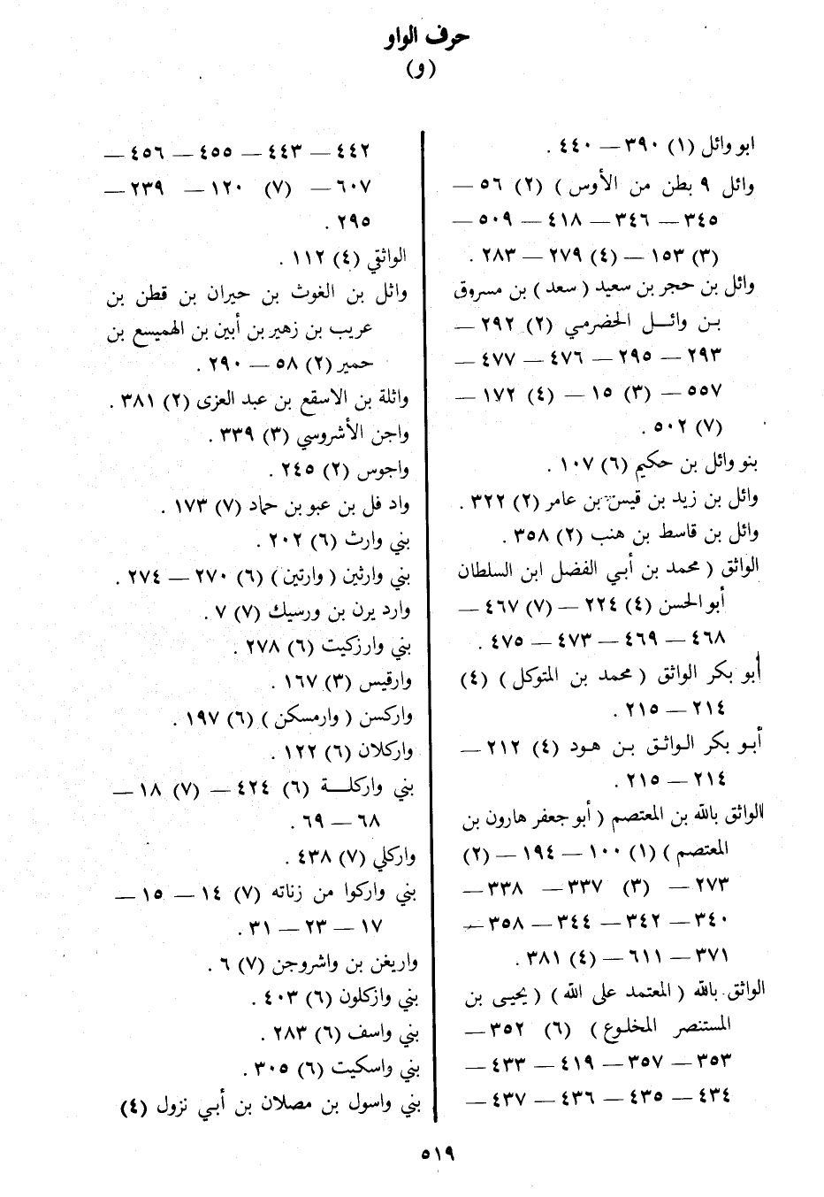 الواثق باللَّه (المعتمد على الله) (يحيى بن المستنصر المخلوع) (6) 352- 353- 357- 419- 433- 434- 435- 436- 437- 442- 443- 455- 456- 607- (7) 120- 239- 295.