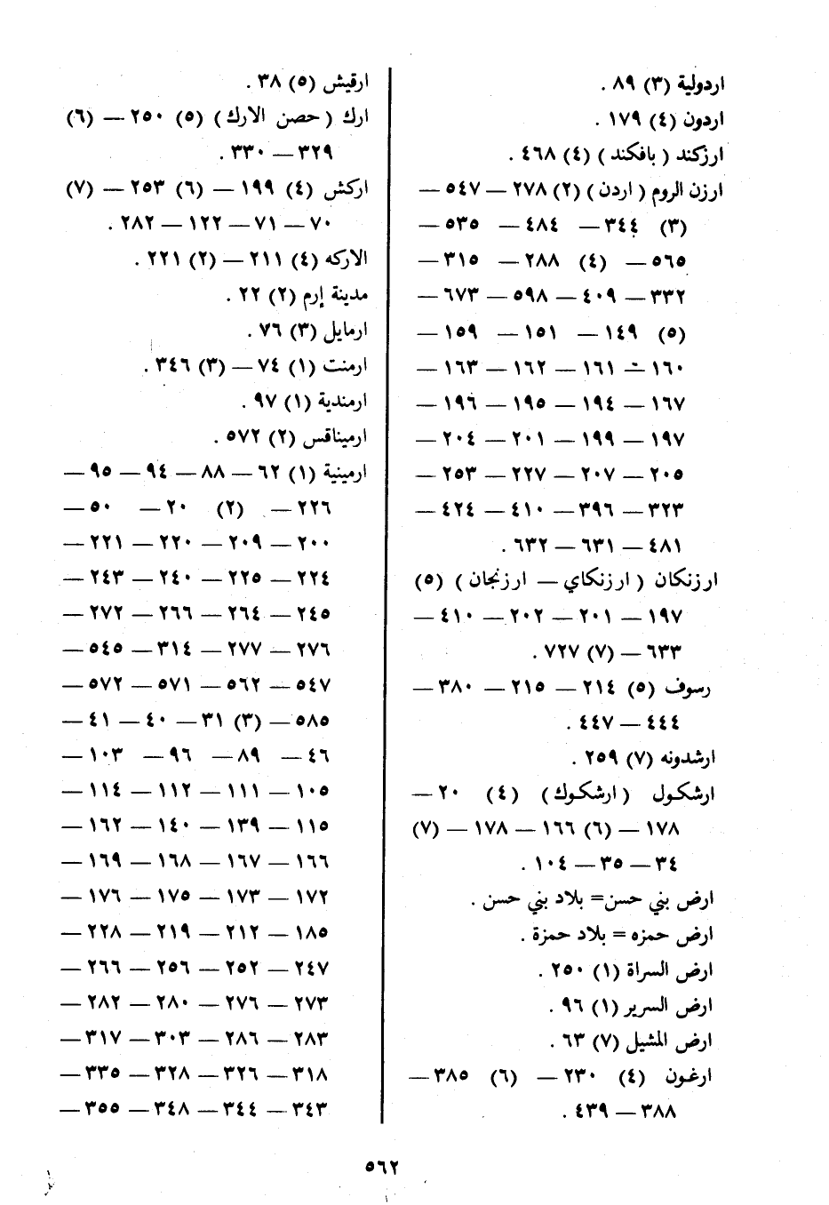 ارزن الروم (أردن) (2) 278- 547- (3) 344- 484- 535- 565- (4) 288- 315- 332- 409- 598- 673- (5) 149- 151- 159- 160- 161- 162- 163- 167- 194- 195- 196- 197- 199- 201- 204- 205- 207- 227- 253- 323- 396- 410- 424- 481- 631- 632.