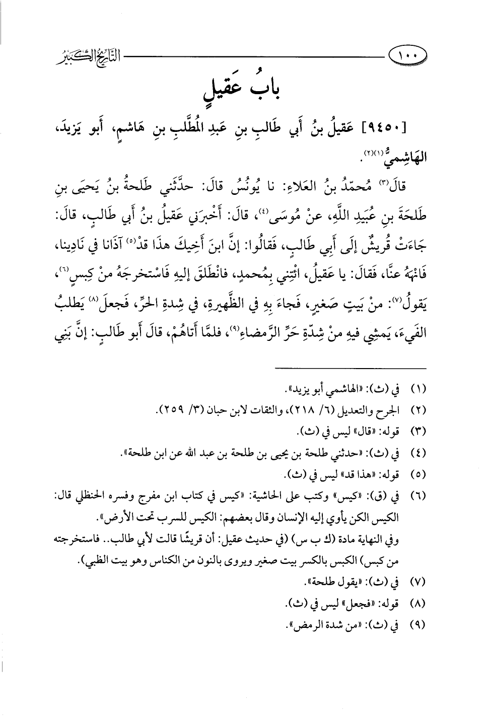 قالَ (¬٣) مُحمّدُ بنُ العَلاءِ: نا يُونُسُ قالَ: حدَّثَني طَلحةُ بنُ يَحيَى بنِ طَلحَةَ بنِ عُبَيدِ اللَّهِ، عنْ مُوسَى (¬٤)، قالَ: أَخْبرَني عَقيلُ بنُ أَبي طَالبٍ، قالَ: جَاءَتْ قُريشٌ إلَى أَبِي طَالبٍ، فَقالُوا: إنَّ ابنَ أَخِيكَ هذَا قدْ (¬٥) آذَانا في نَادِينا، فَانْهَهُ عنَّا، فَقالَ: يا عَقيلُ، ائْتِني بِمُحمدٍ، فانْطَلقَ إليهِ فَاسْتخرجَهُ منْ كِبسٍ (¬٦)، يَقولُ (¬٧): منْ بَيتٍ صَغيرٍ، فَجاءَ بِهِ في الظَّهيرةِ، في شِدةِ الحرِّ، فَجعلَ (¬٨) يَطلبُ الفَيءَ، يَمشِي فيهِ منْ شِدّةِ حَرِّ الرَّمضاءِ (¬٩)، فلمَّا أَتاهُمْ، قالَ أَبو طَالبٍ: إنَّ بَنِي