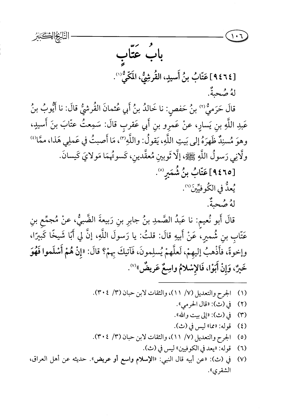 قالَ أَبو نُعيمٍ: نا عَبدُ الصَّمدِ بنُ جابرِ بنِ رَبيعةَ الضَّبيُّ، عنْ مُجمِّعِ بنِ عَتّابِ بنِ شُميرٍ، عَنْ أَبيهِ قالَ: قلتُ: يا رَسولَ اللَّهِ، إنَّ لي أَبًا شَيخًا كَبيرًا، وإخوةً، فأَذْهبُ إليهِمْ، لَعلَّهمْ يُسلِمونَ، فَآتيكَ بِهمْ؟ قالَ: "إِنْ هُمْ أَسْلَموا فَهُوَ خَيرٌ، وَإِنْ أَبَوْا، فَالإِسْلامُ واسِعٌ عَريضٌ" (¬٧).