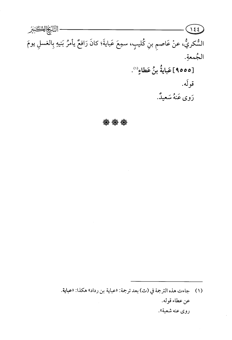 السُّكريُّ، عنْ عَاصمِ بنِ كُليبٍ، سمِعَ عَبايةَ؛ كانَ رَافع يأمرُ بَنيهِ بِالغسلِ يومَ الجُمعةِ.