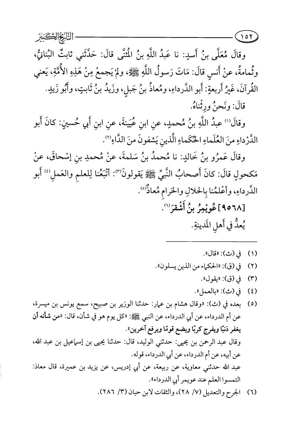 عبد اللَّه حدثني معاوية، عن ربيعة، عن أبي إدريس، عن يزيد بن عميرة، قال معاذ: التمسوا العلم عند عويمر أبي الدرداء".