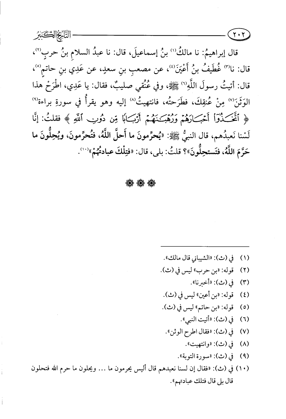 قال إبراهيمُ: نا مالكُ (¬١) بنُ إسماعيلَ، قال: نا عبدُ السلامِ بنُ حربٍ (¬٢)، قال: نا (¬٣) غُطَيفُ بنُ أَعْيَنَ (¬٤)، عن مصعبِ بنِ سعدٍ، عن عَدِي بنِ حاتمٍ (¬٥)، قال: أتيتُ رسولَ اللَّهِ (¬٦) -صلى اللَّه عليه وسلم-، وفي عُنُقي صليبٌ، فقال: يا عَدِي، اطْرَحْ هذا الوَثَنَ (¬٧) مِنْ عُنقِكَ، فطَرَحتُه، فانتهيتُ (¬٨) إليه وهو يقرأُ في سورةِ براءة (¬٩) {اتَّخَذُوا أَحْبَارَهُمْ وَرُهْبَانَهُمْ أَرْبَابًا مِنْ دُونِ اللَّهِ} فقلتُ: إنَّا لَسْنا نَعبدُهم، قال النبيُّ -صلى اللَّه عليه وسلم-: "يُحرِّمونَ ما أَحلَّ اللَّهُ، فتُحرِّمونَ، ويُحِلُّونَ ما حَرَّمَ اللَّهُ، فتَستحِلُّونَ"؟ قلتُ: بلى، قال: "فتِلْكَ عبادتُهُمْ" (¬١٠).